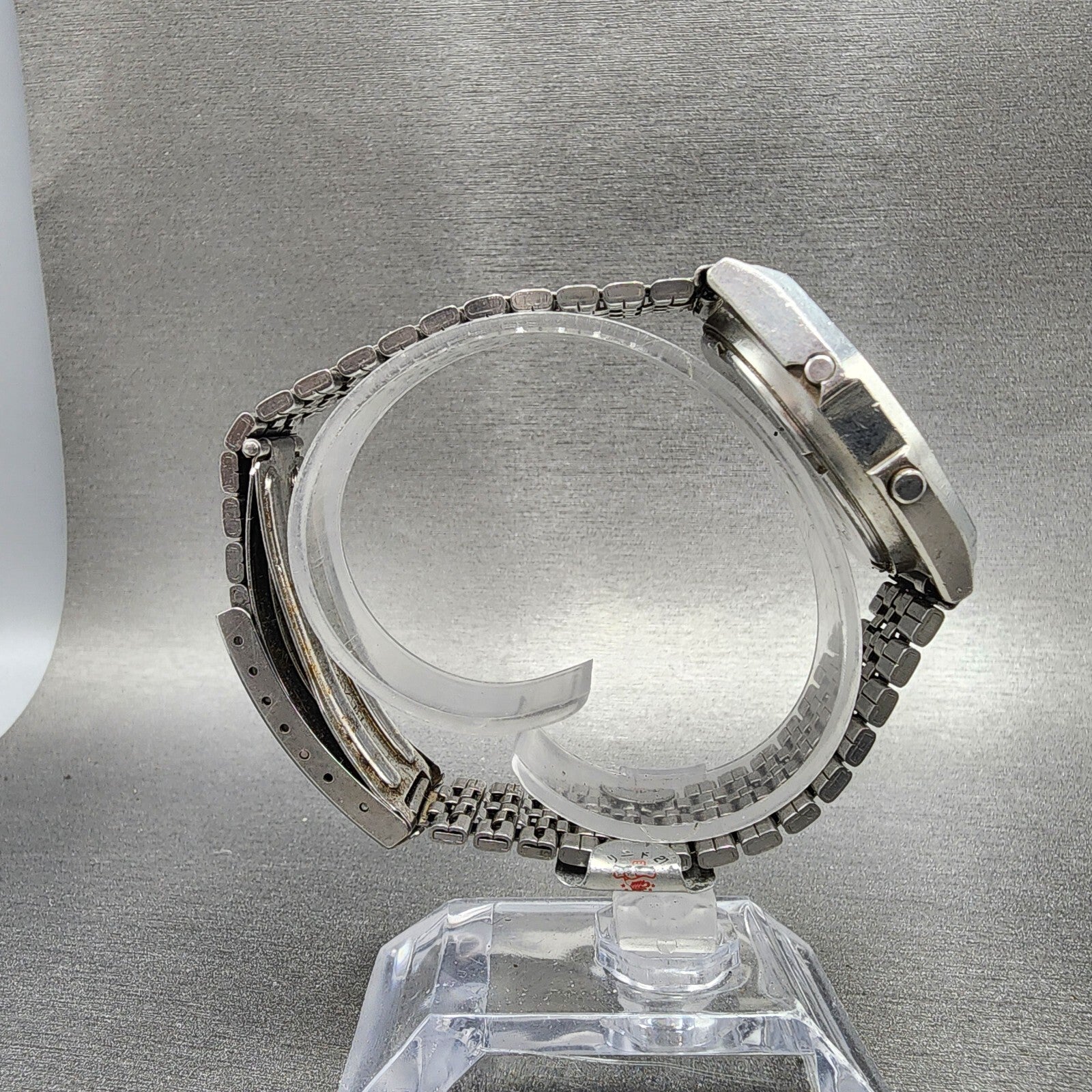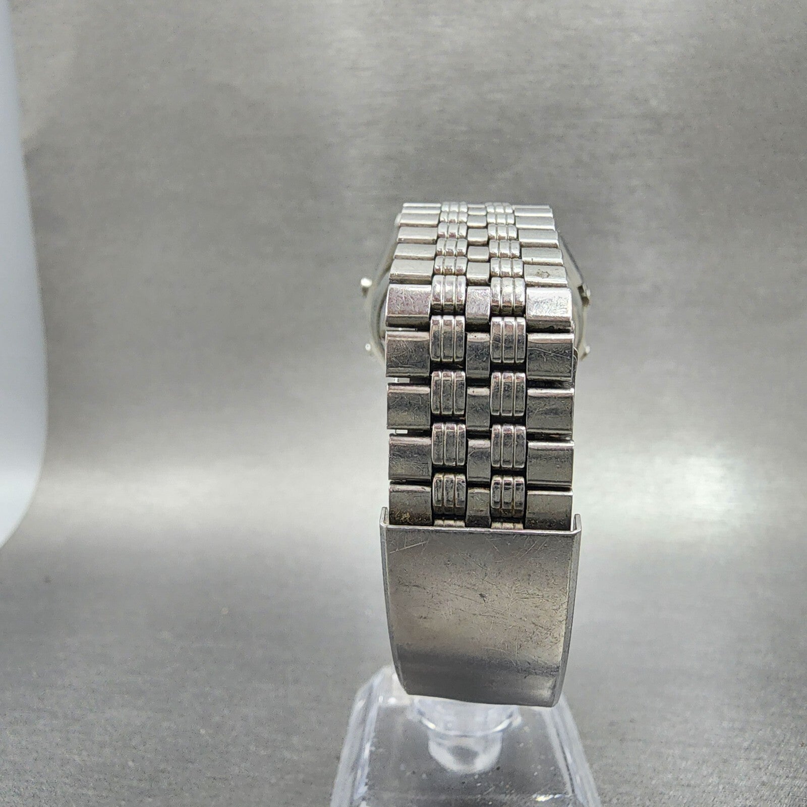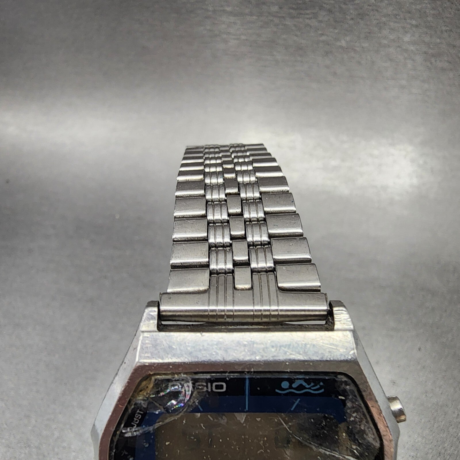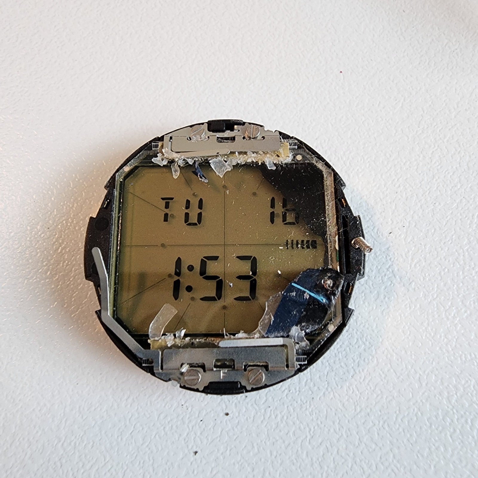 THE CRYSTAL IS CHIPPED AND CRACKED. THE ALARM SPEAKER DOES NOT WORK. THE DIGITAL DISPLAY IS ALSO DAMAGED ON THE TOP RIGHT CORNER. This watch has been used but is in good working condition. There is scratches on the watch. please refer to pictures.