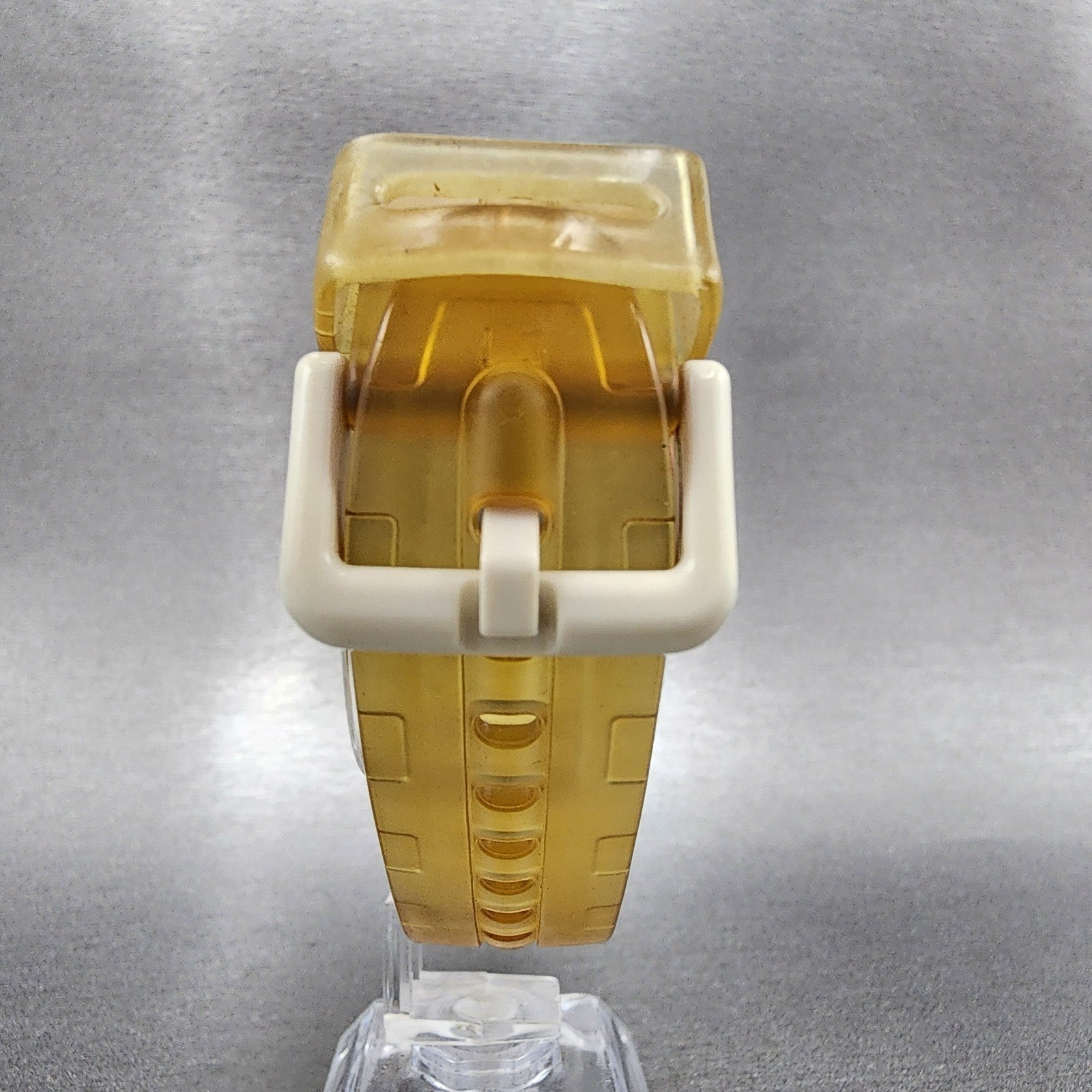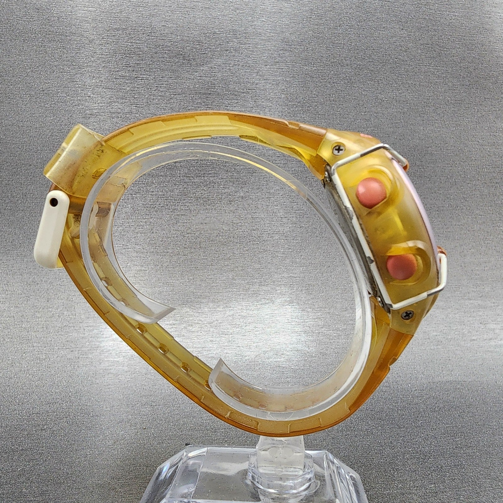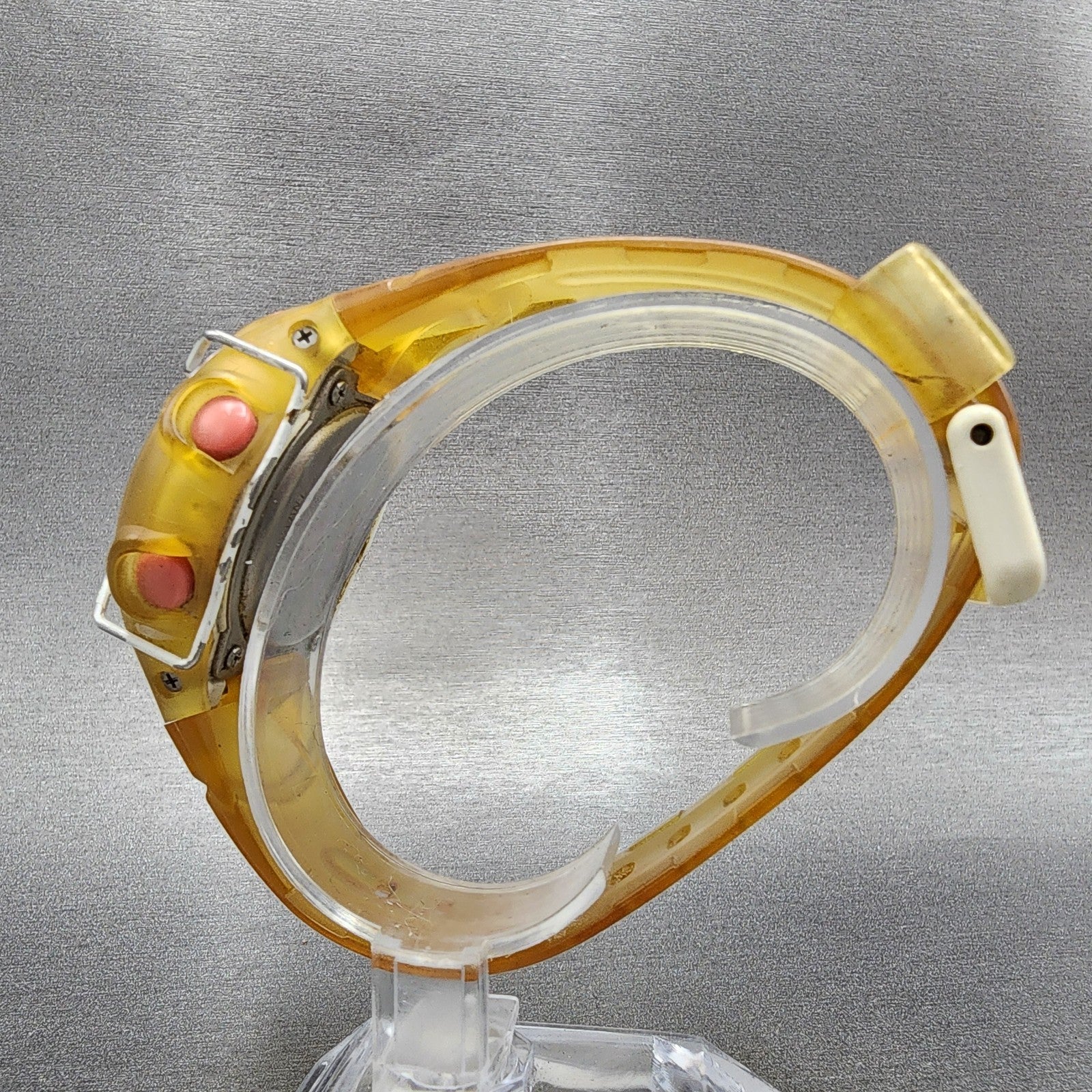 This watch has been used but is in good working condition. There is scratches on the watch. please refer to pictures. The part that holds down the excess band when worn has a crack.