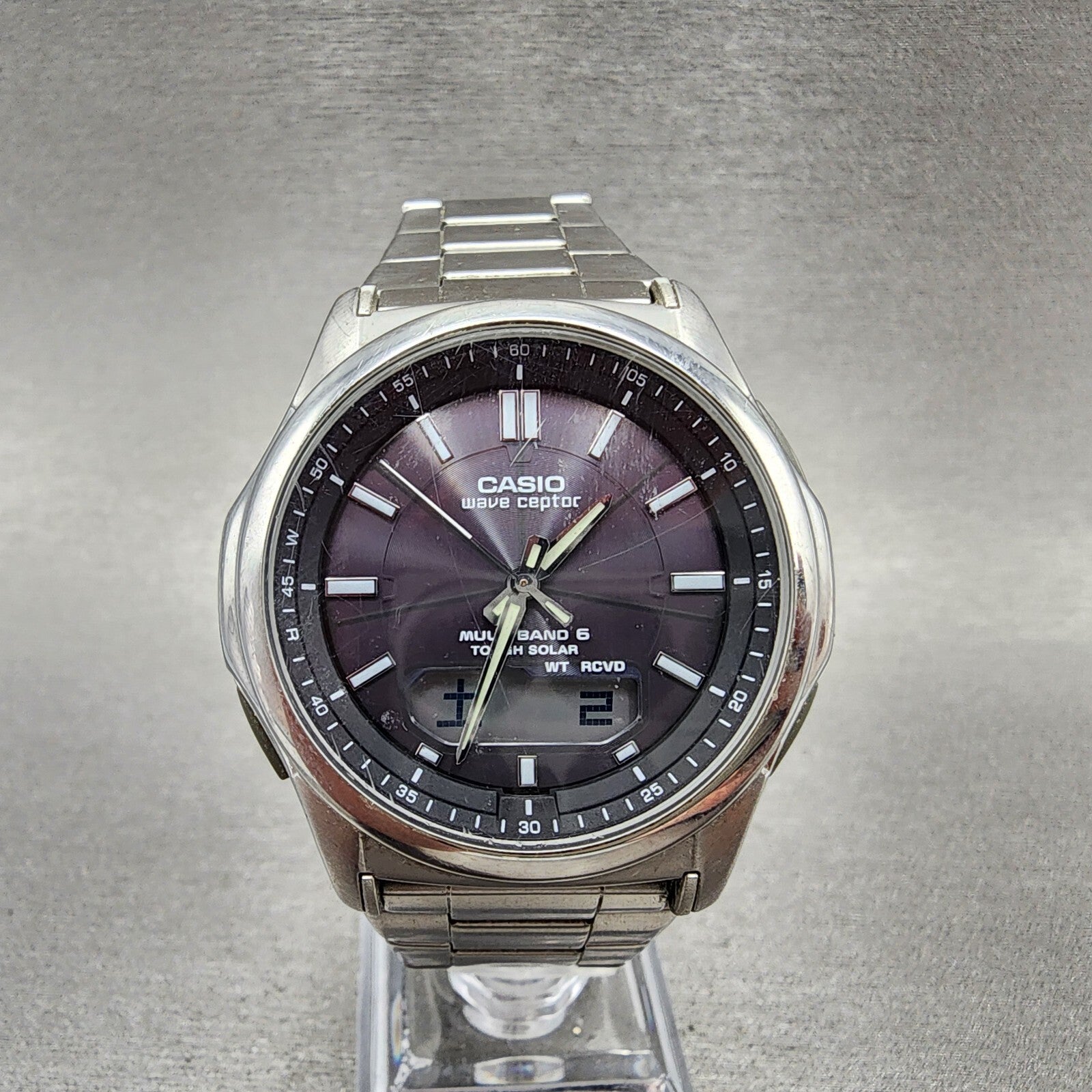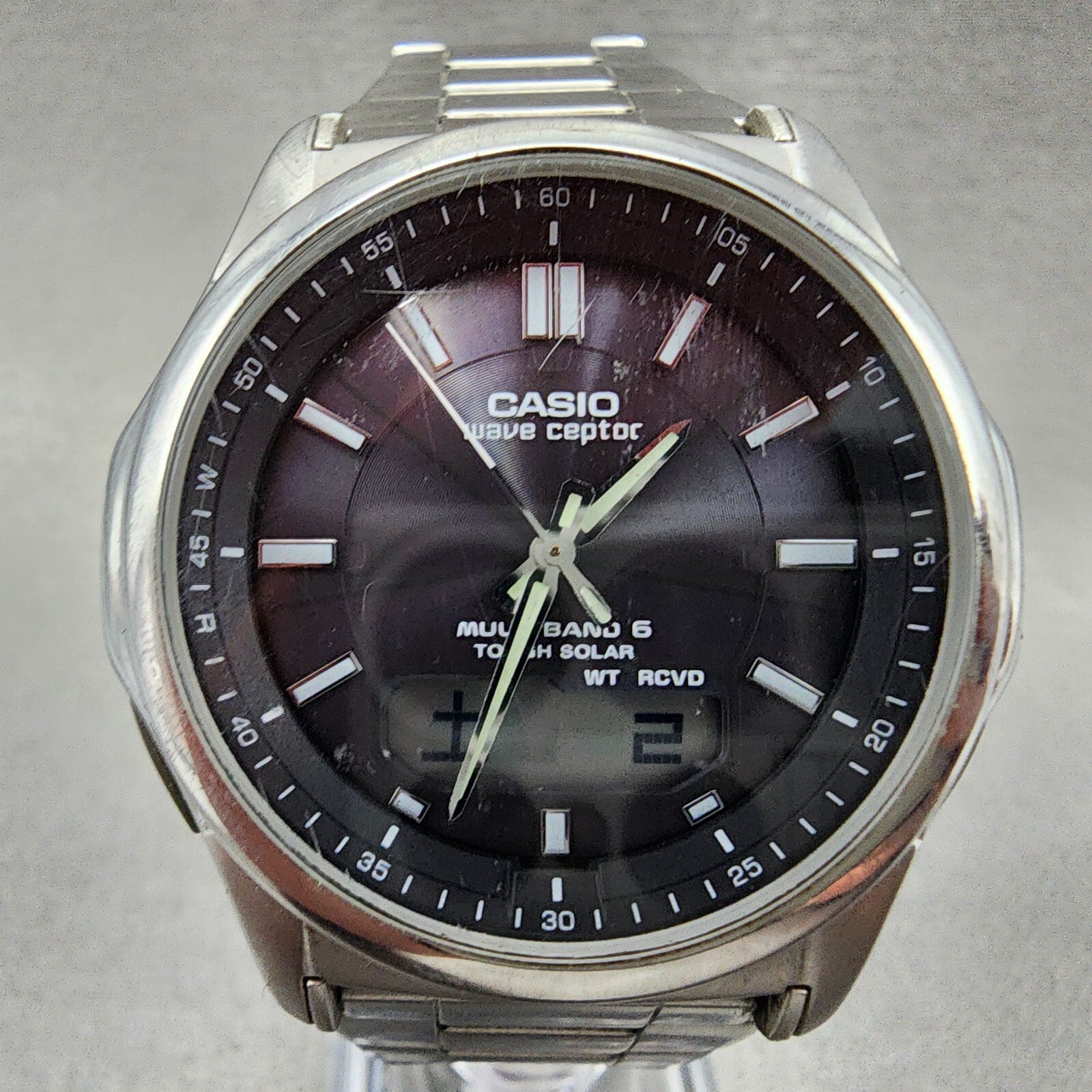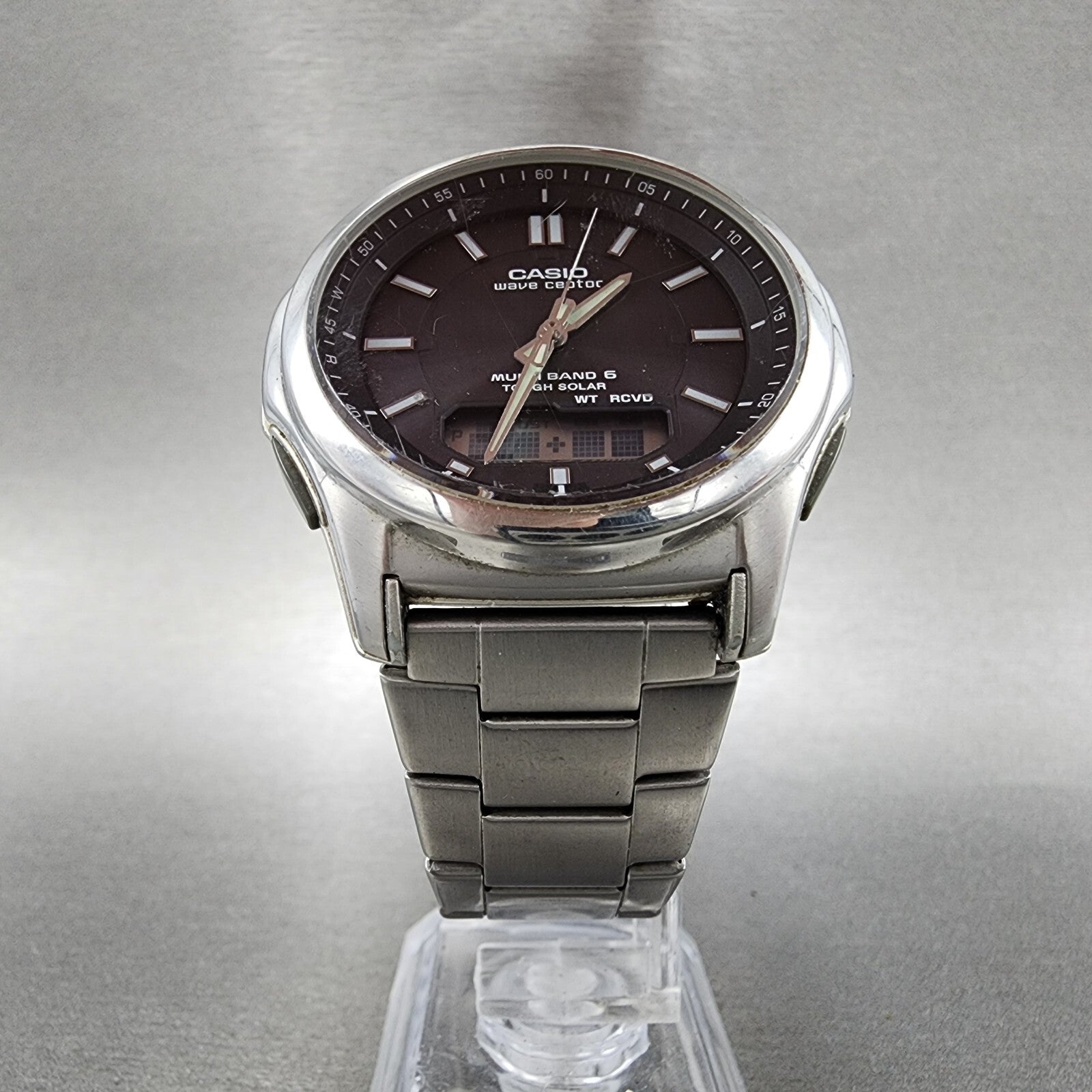Casio Wave Ceptor Watch Men 42mm Black Dial Steel Analog Digital Solar Runs B12