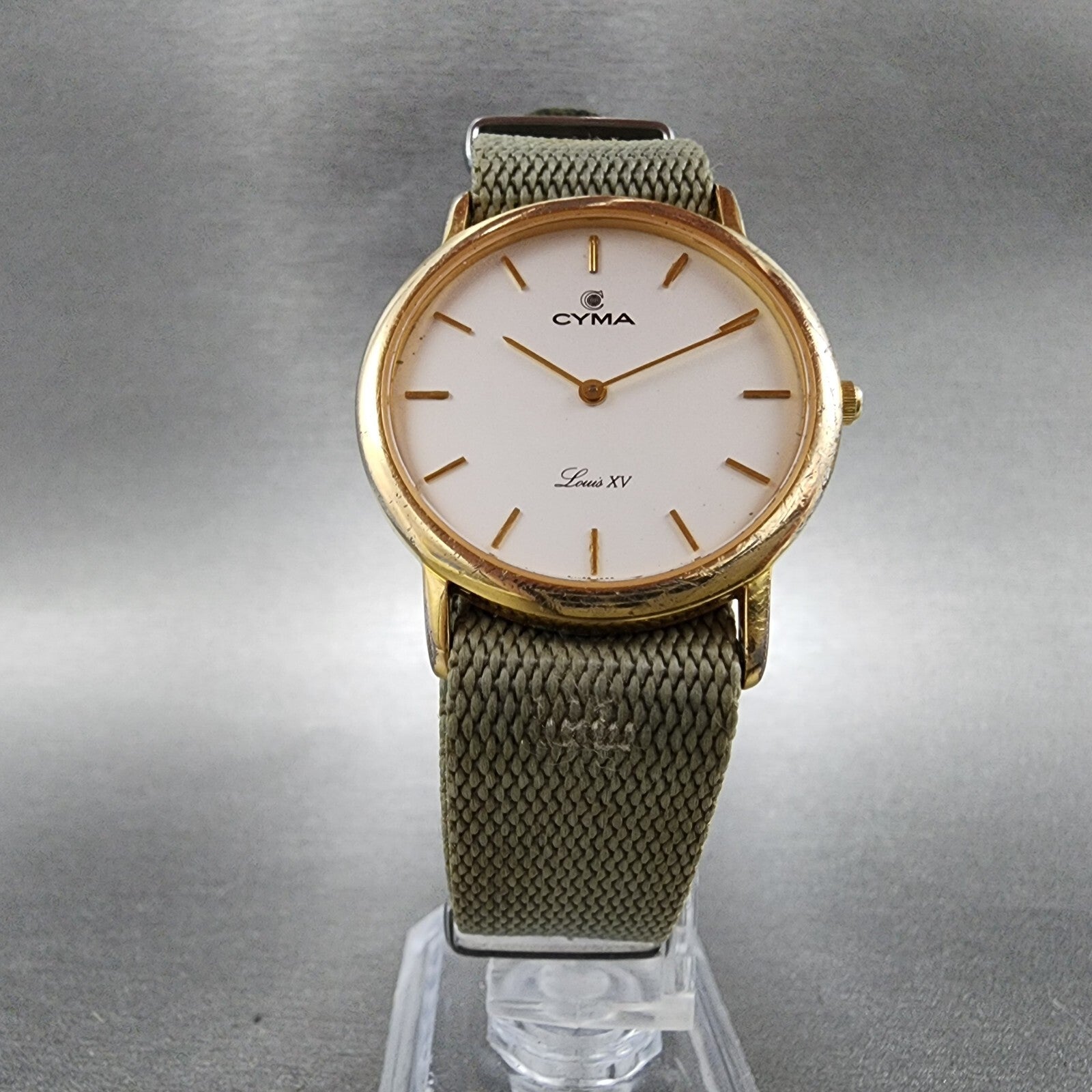 Cyma Louis XV Watch Men 32mm White Dial Gold Tone Round Nato Strap New Battery