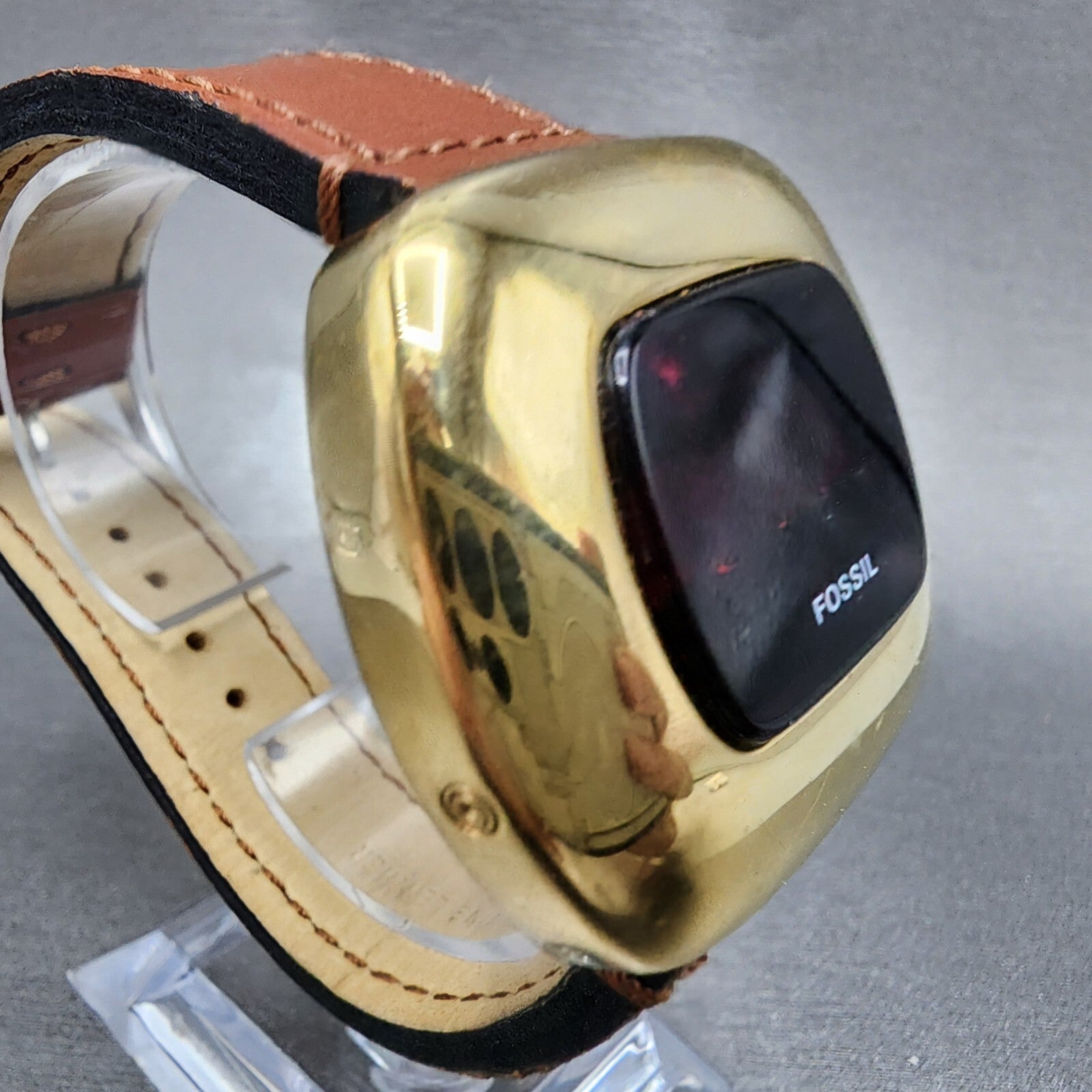 Fossil Red LED Watch Men 43mm Black Dal Gold Tone Cushion JR-7776 New Battery