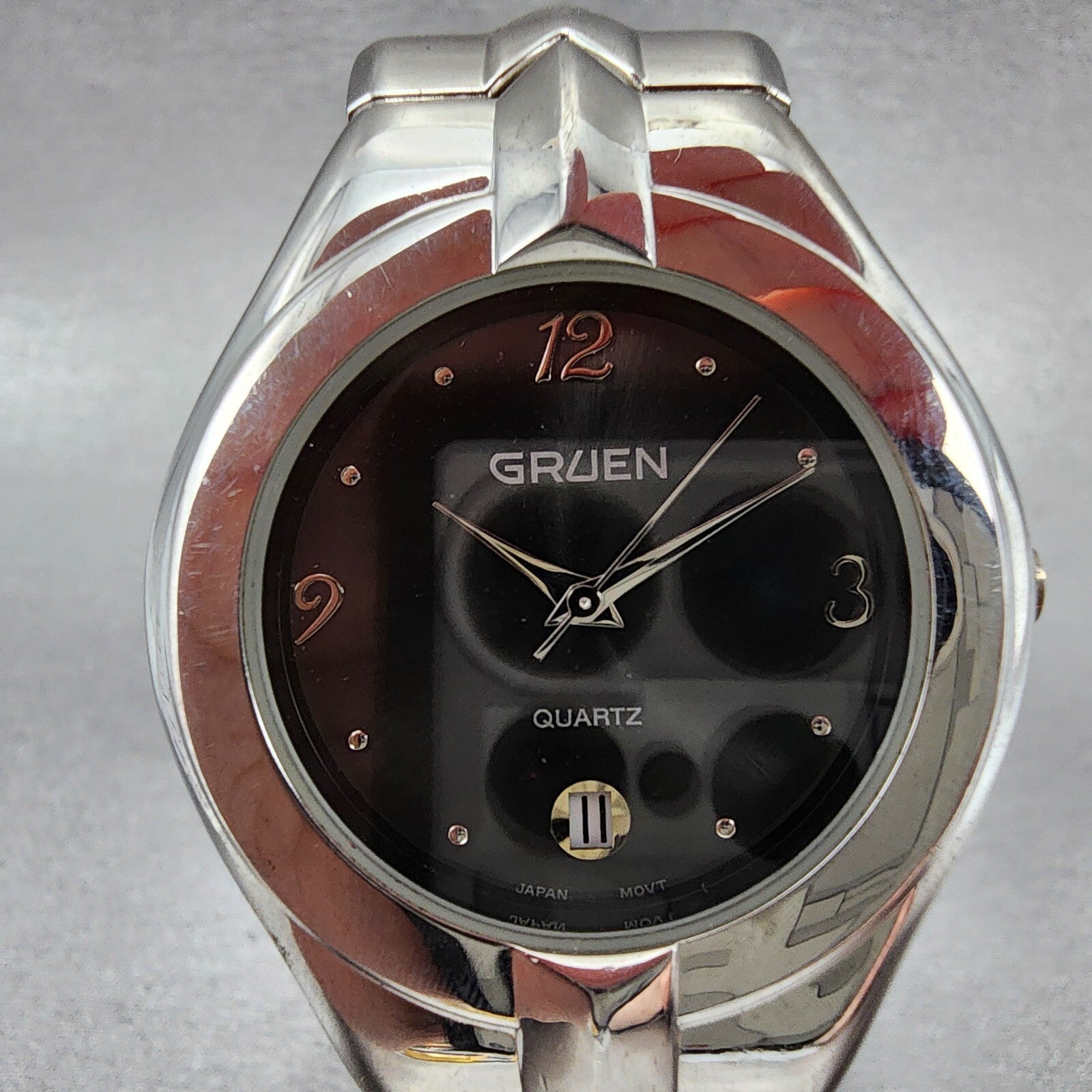Gruen Watch Men 37mm Gray Dial Silver Tone Date Round PC32 New Battery