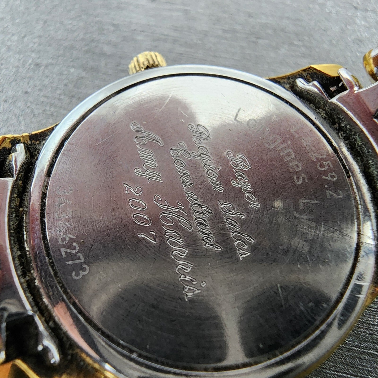 Company logo on dial and engravings on the back. This watch has been used but is in good working condition. There is scratches on the watch. please refer to pictures.