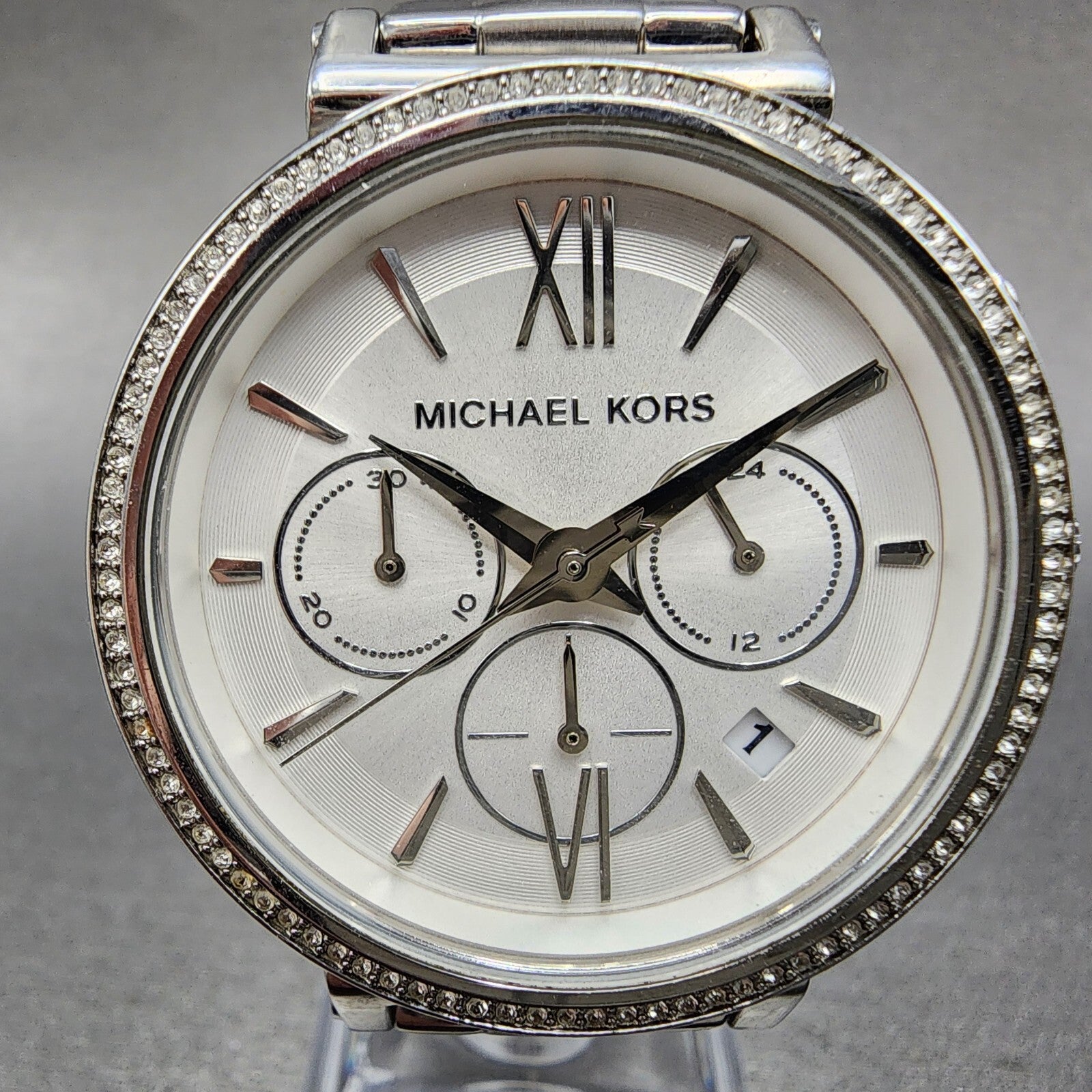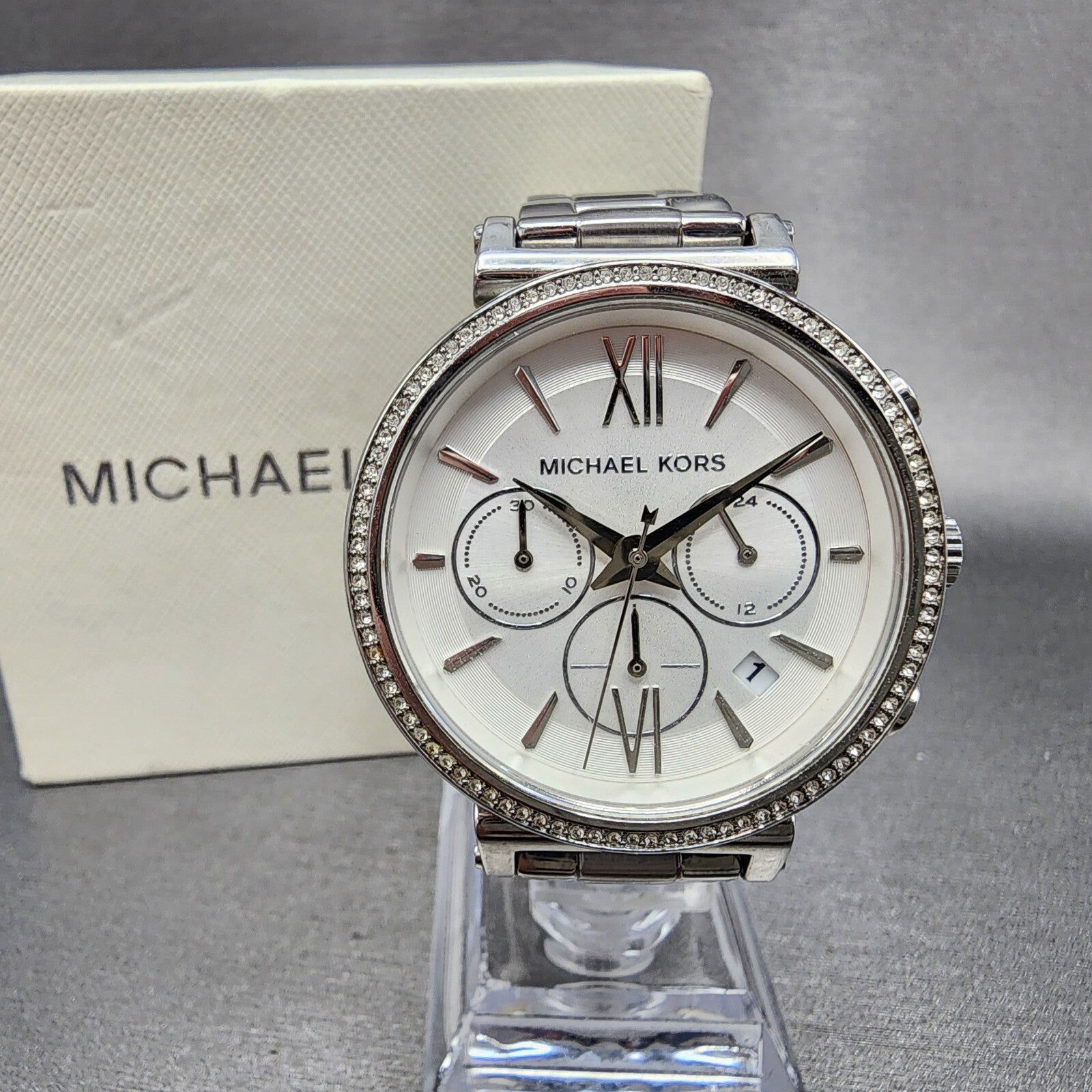 Michael Kors Sofie Watch Women 38mm White Dial Steel Date Chronograph New Batt