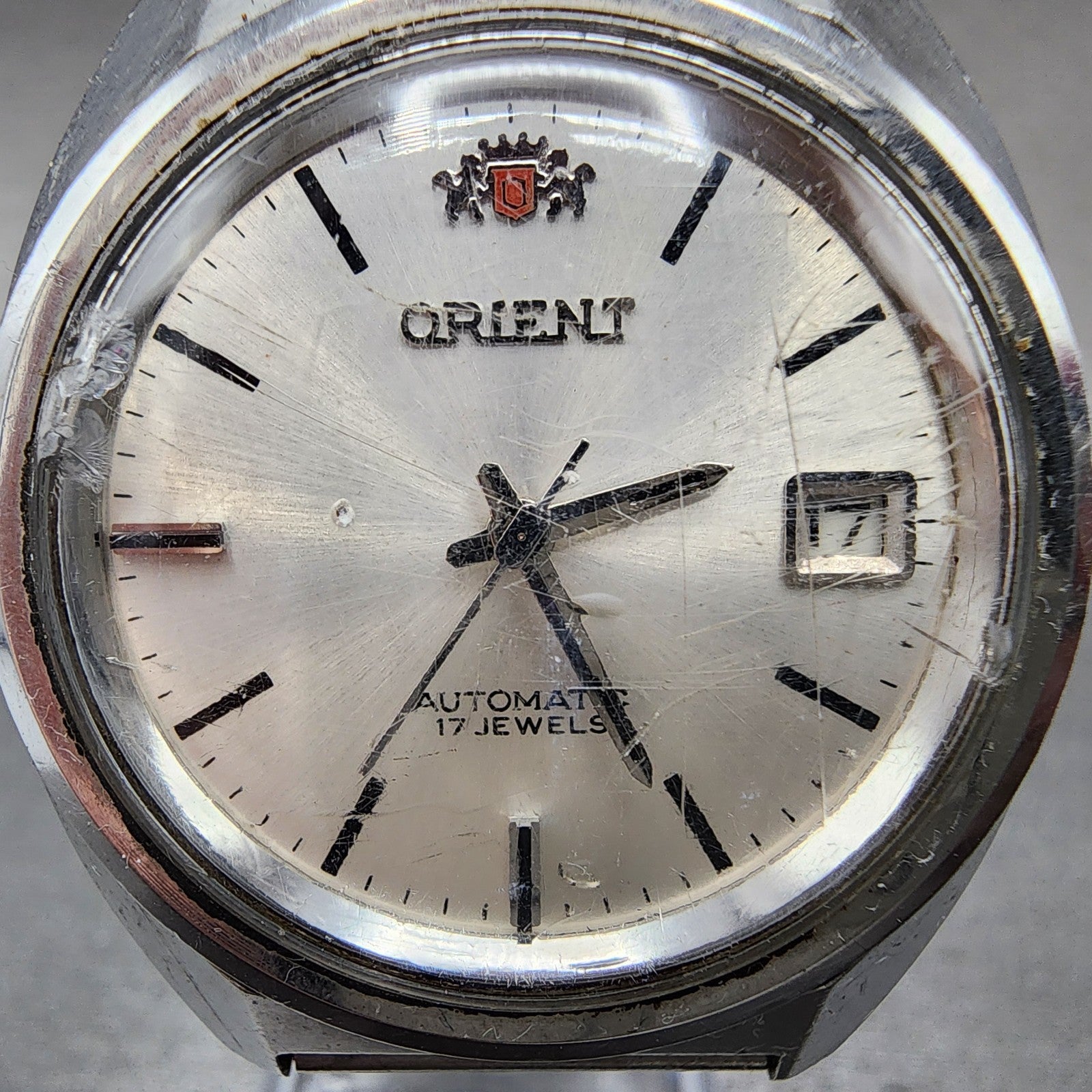 Orient Automatic Watch Men 37mm White Dial SIlver Tone Date NO CROWN Runs VTG