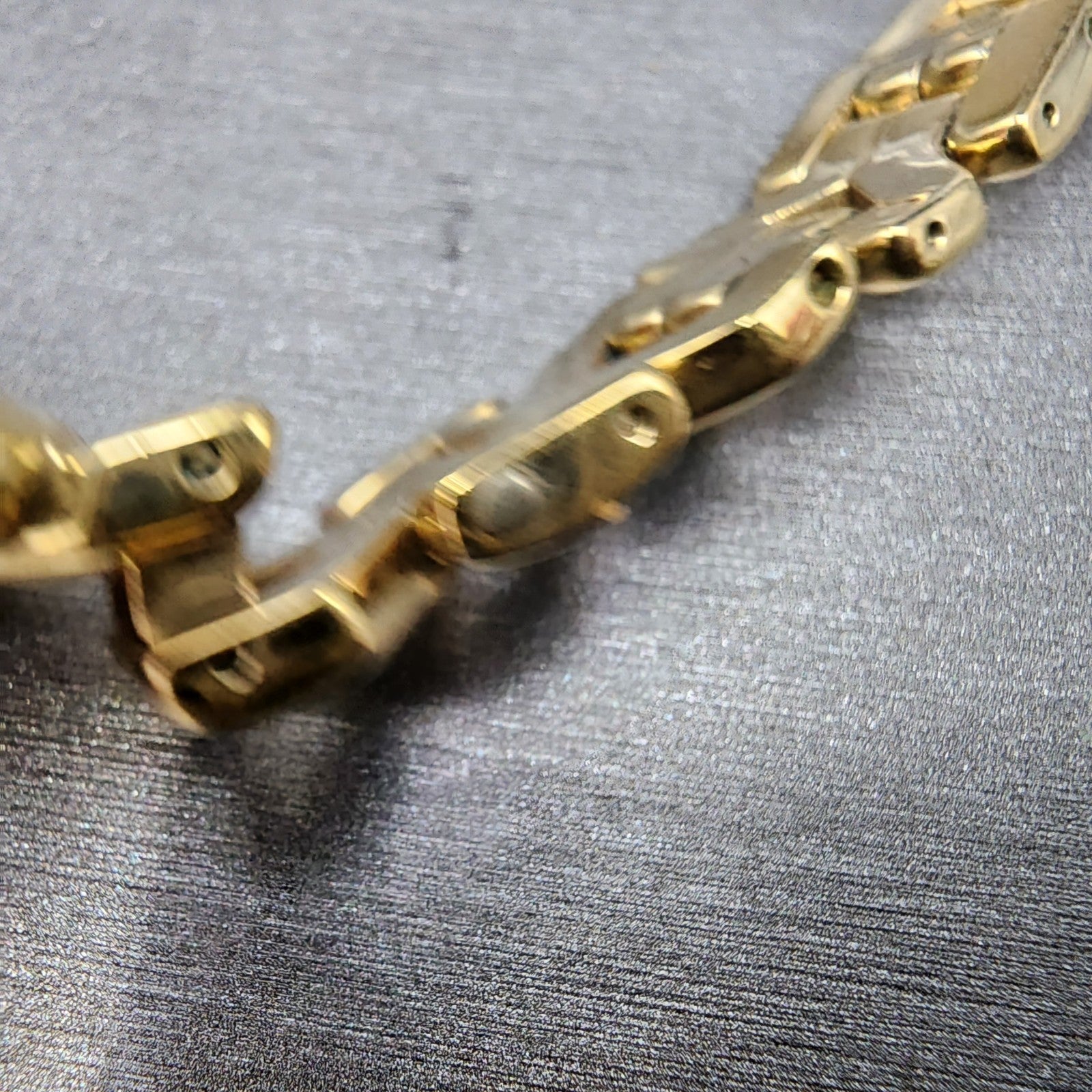 ONE OF THE PINS ON THE BAND HAS BEEN REPLACED WITH A NAIL. This watch has been used but is in good working condition. There is scratches on the watch. please refer to pictures. the dial has some spotting and the gold plating has some discoloration.