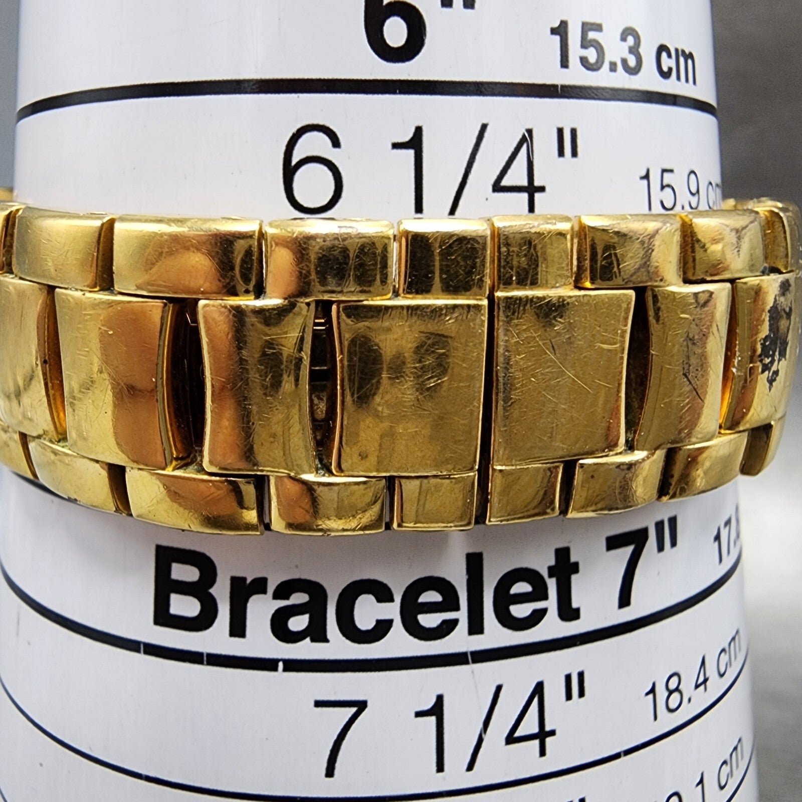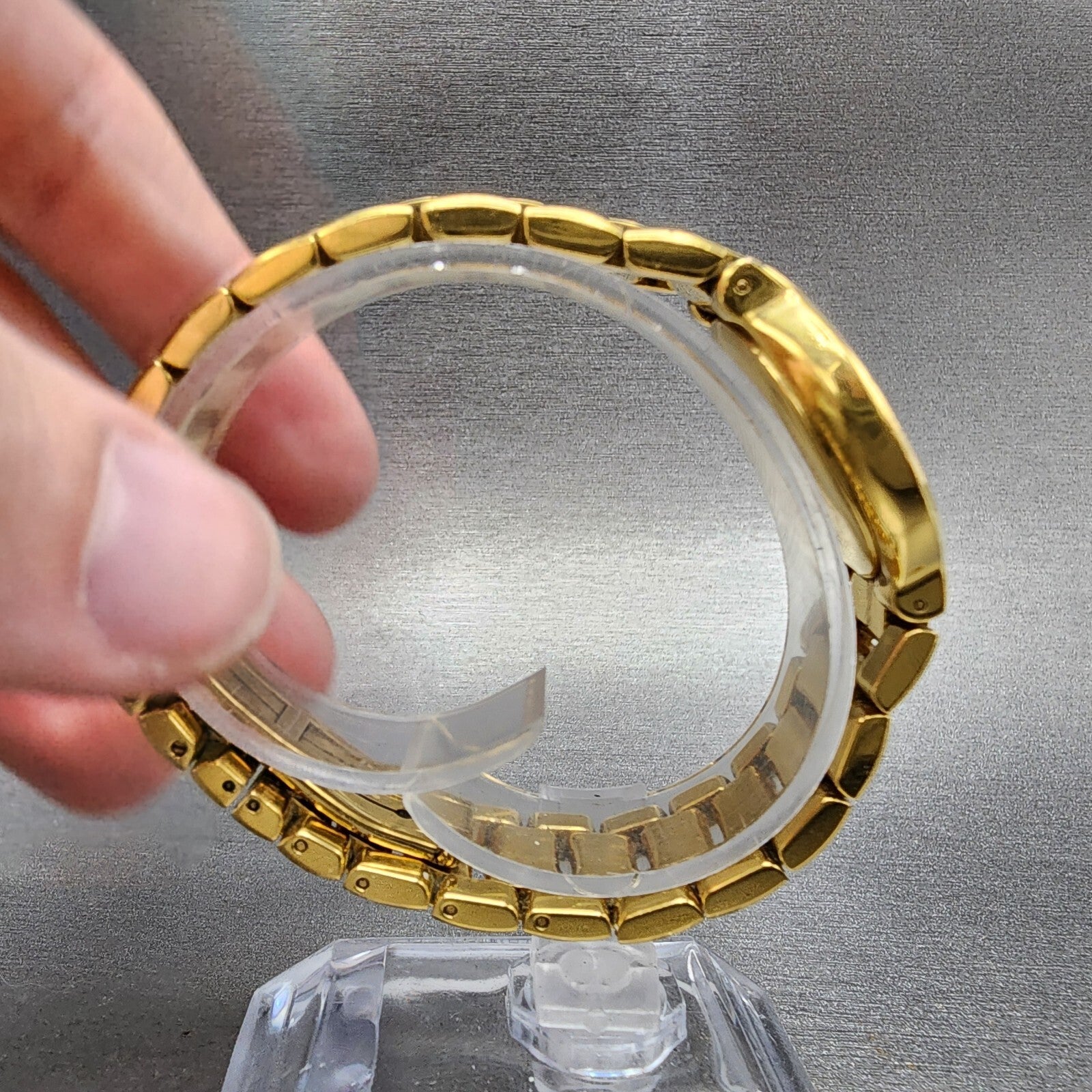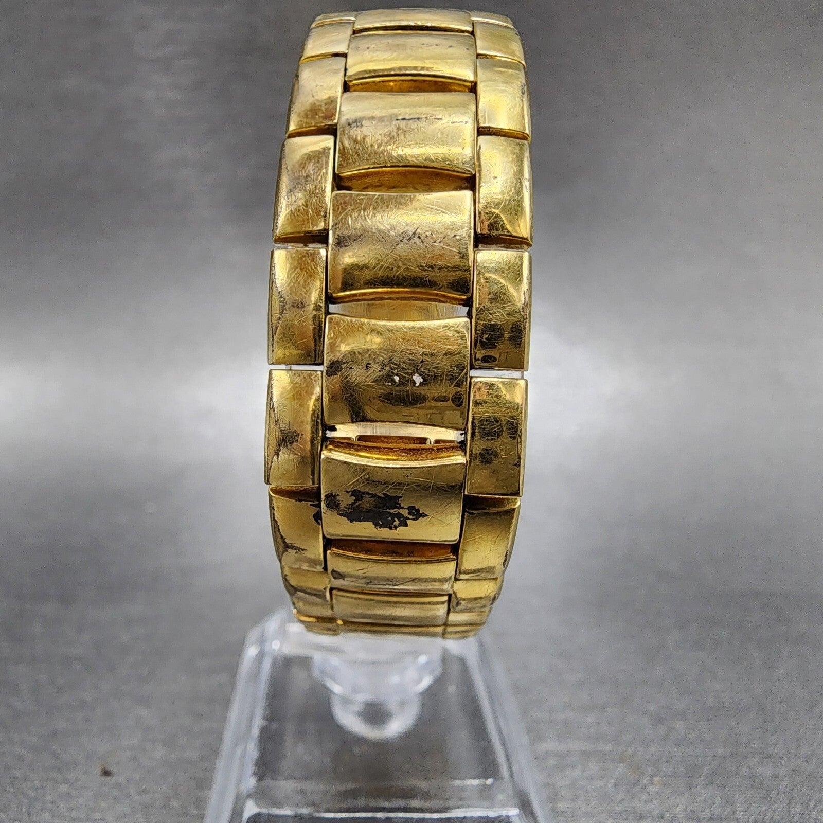 This watch has been used but is in good working condition. There is scratches on the watch. please refer to pictures. the band has some plating wear
