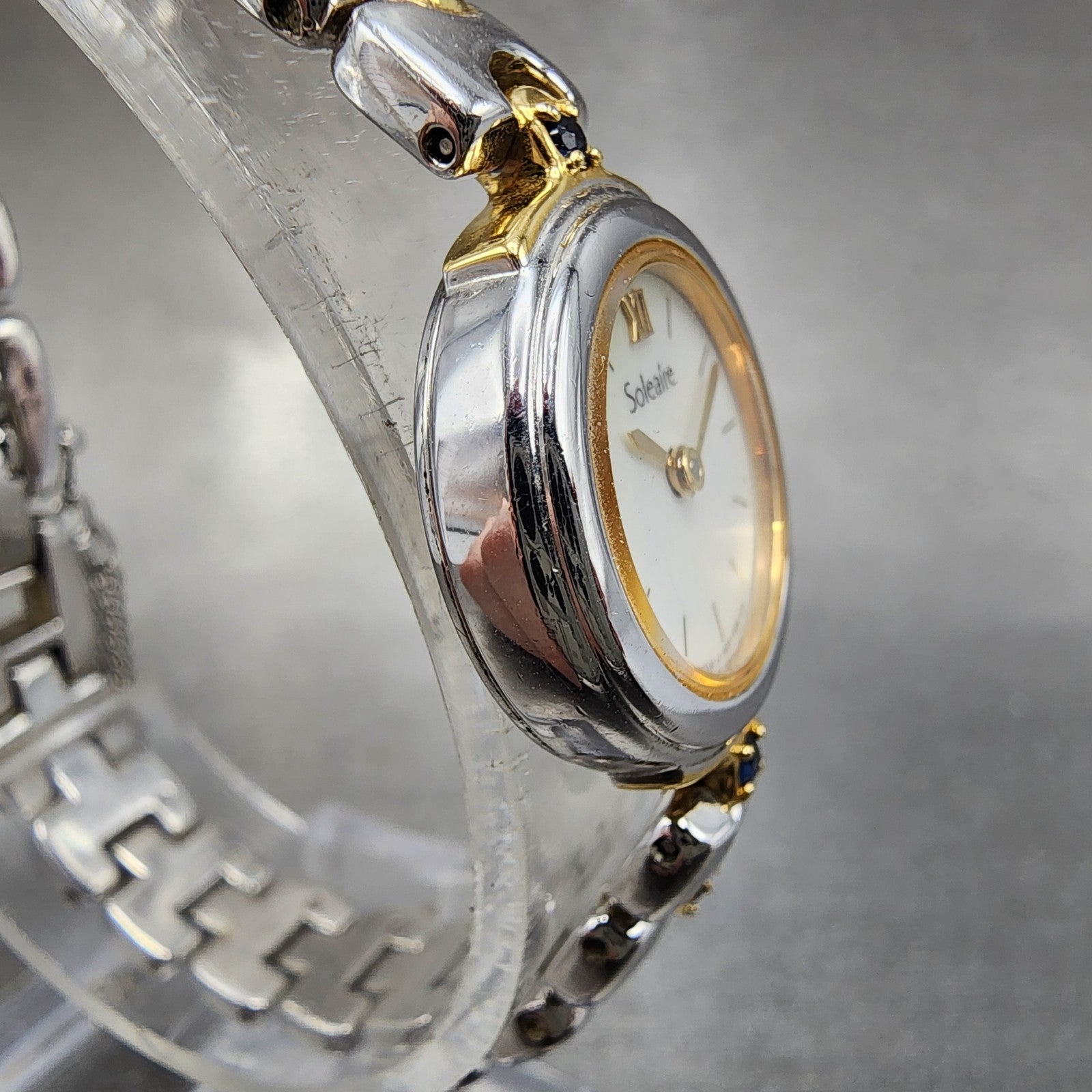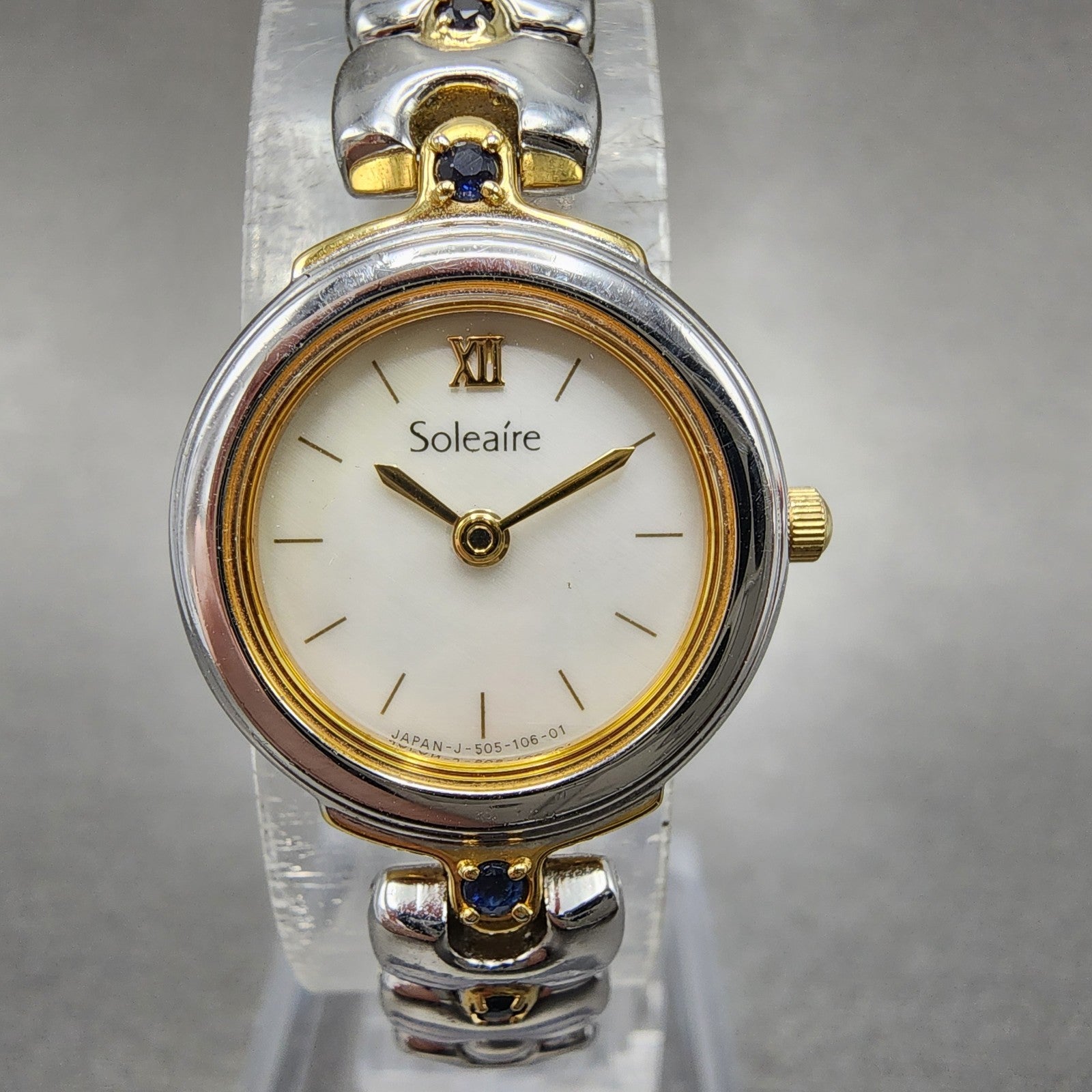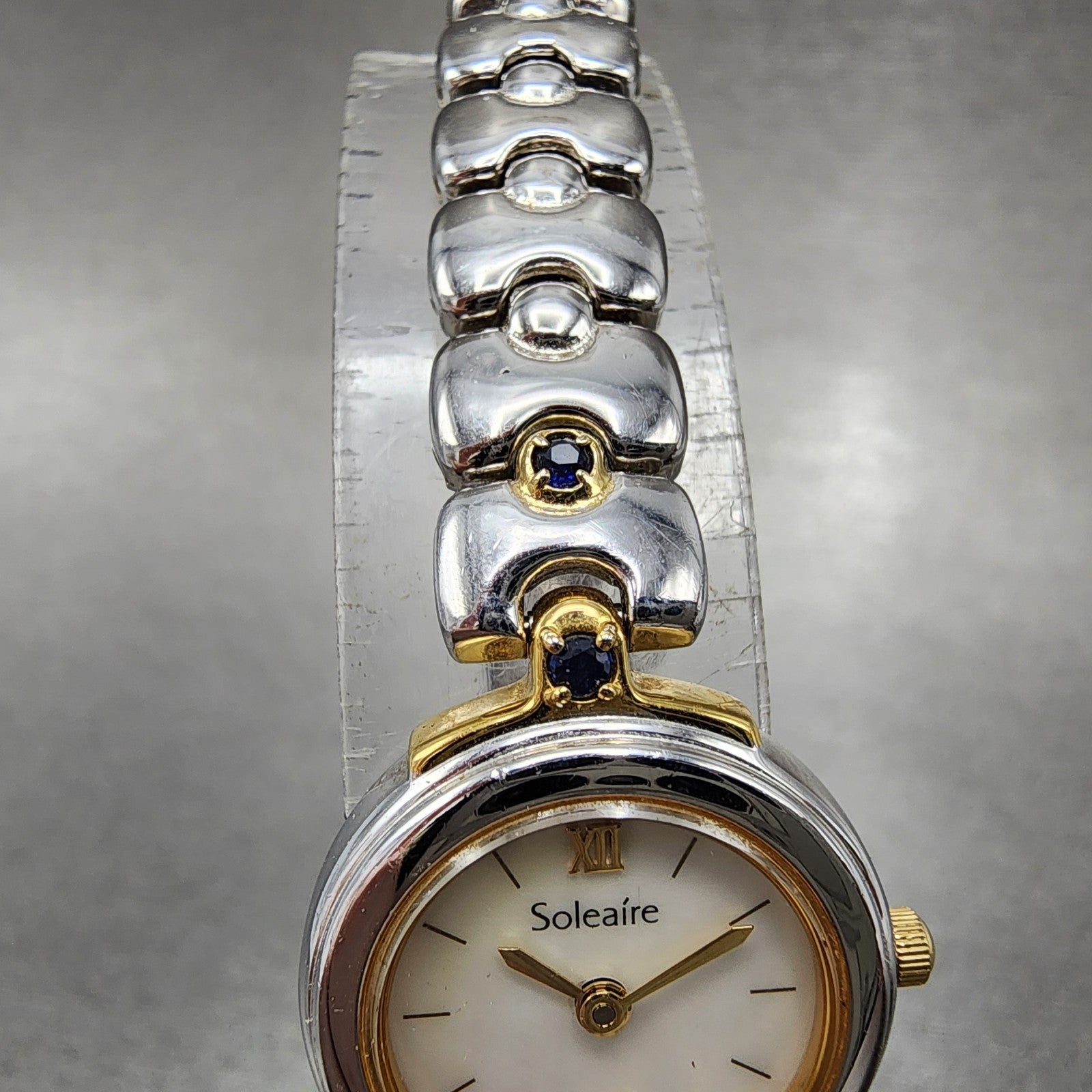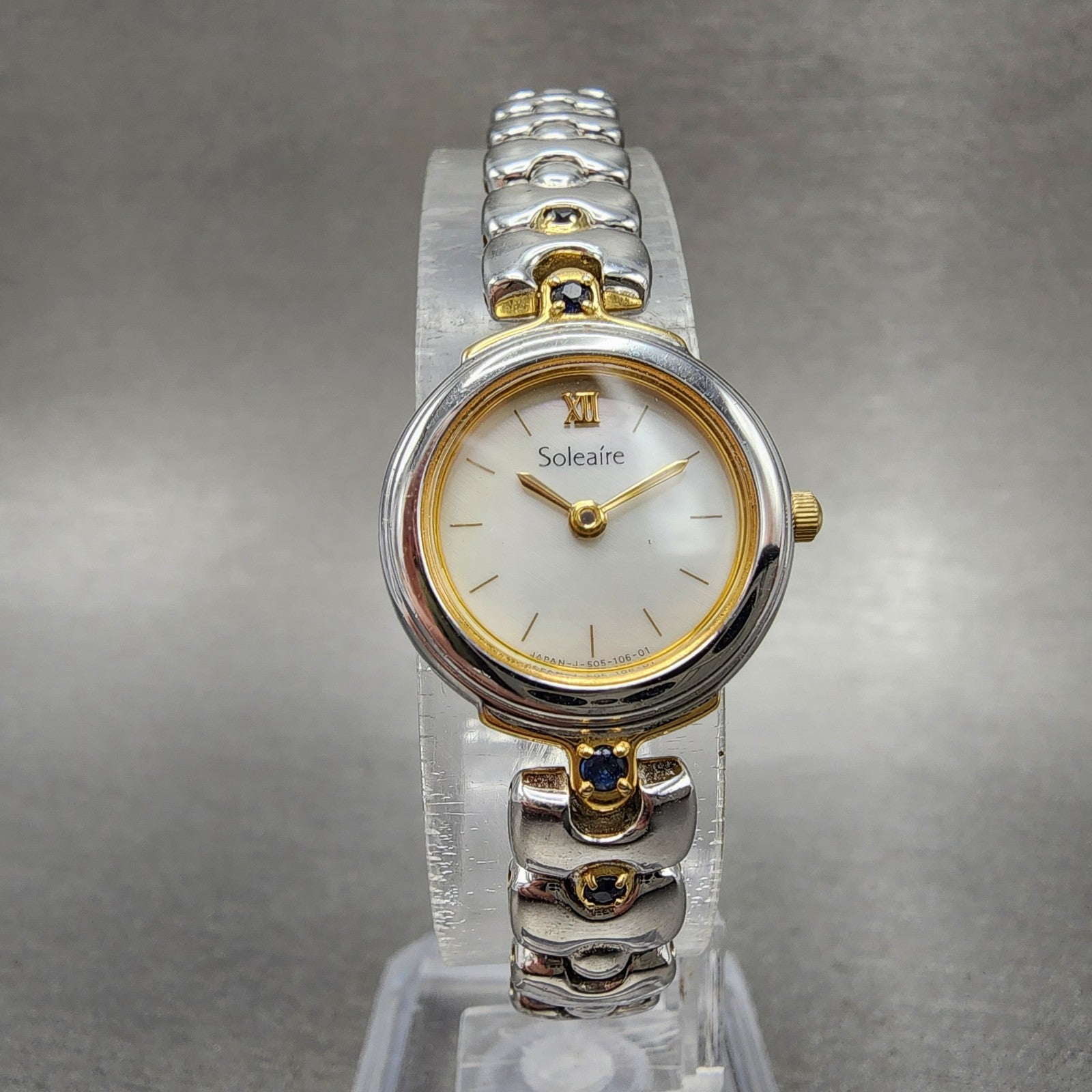 Ricoh Soleaire Watch Women 20mm MOP Dial Two Tone Blue Gemstones Round New Batt
