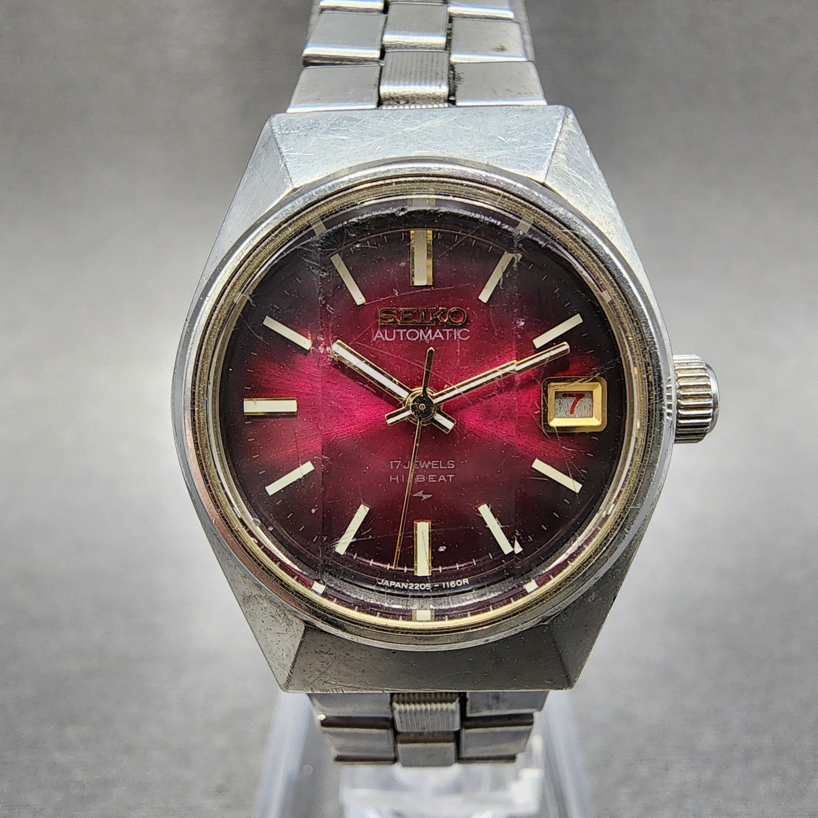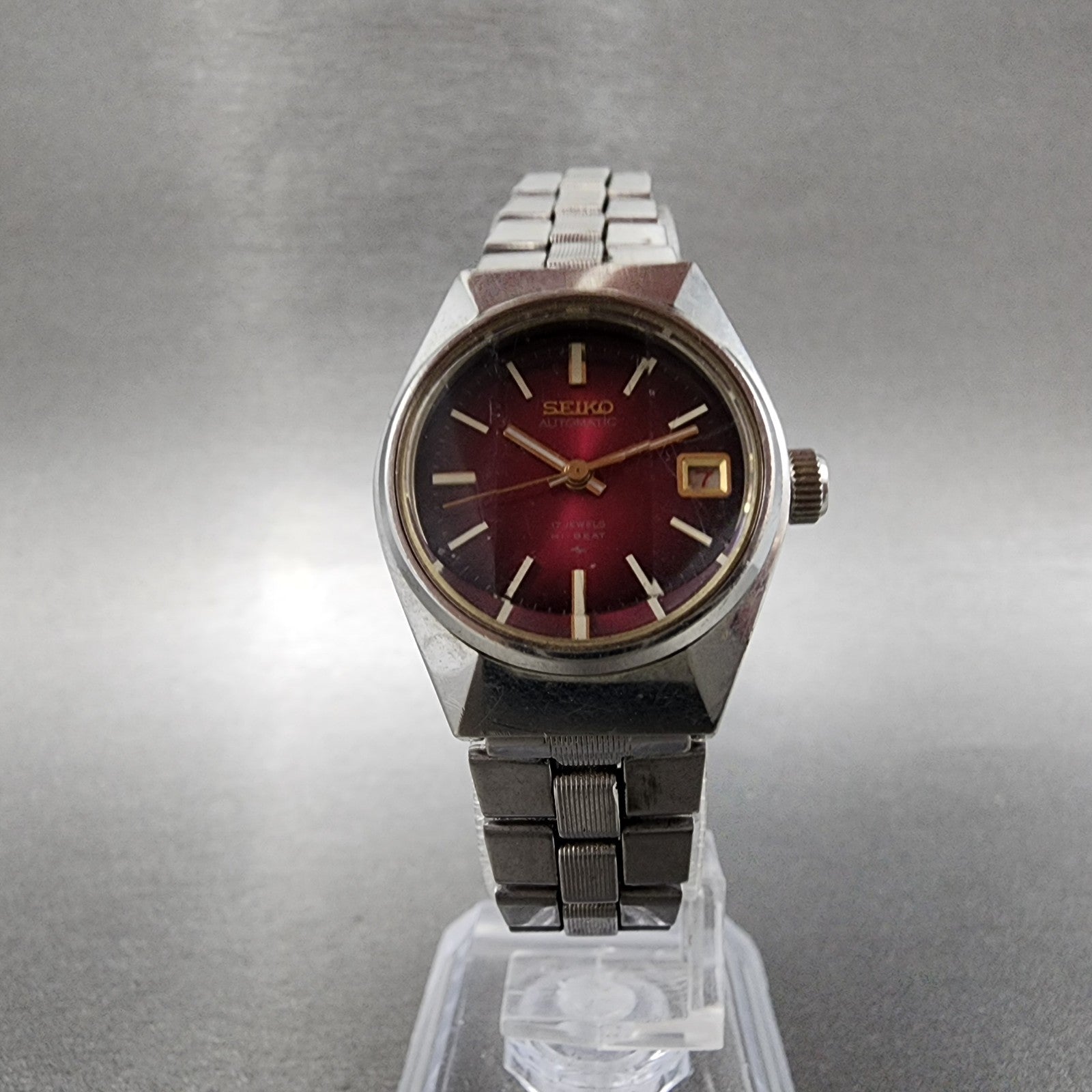 Seiko Automatic Watch Women 24mm Red Dial Silver Tone Date 2205-0679 Runs