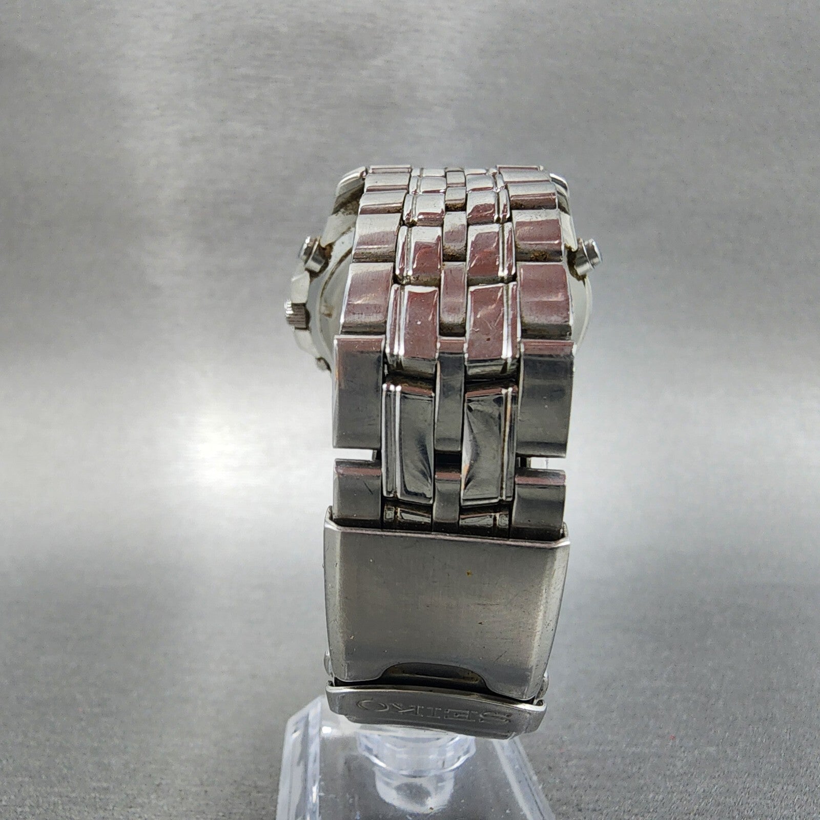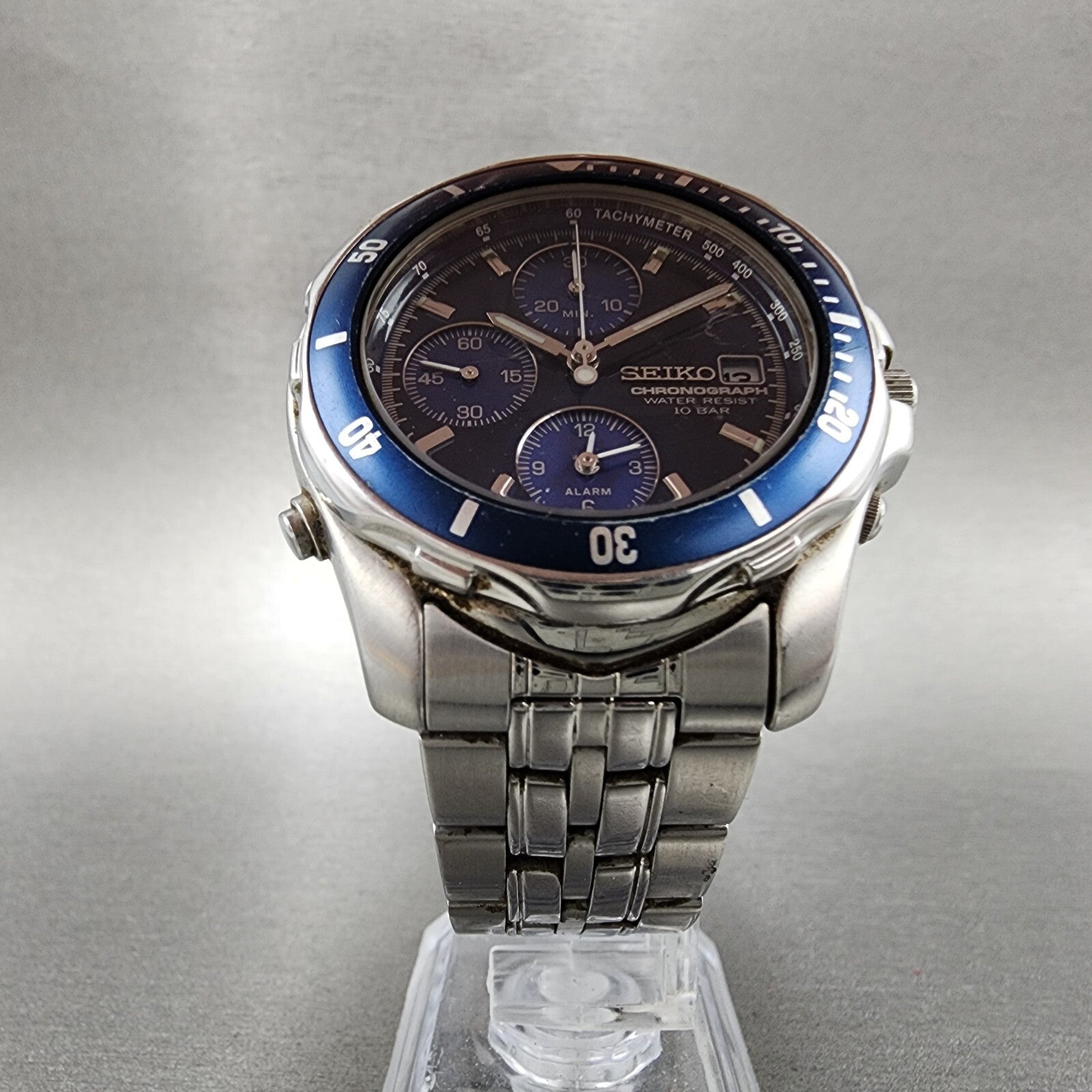 Seiko Chronograph Watch Men 40mm Blue Dial Steel Date Alarm Round New Battery