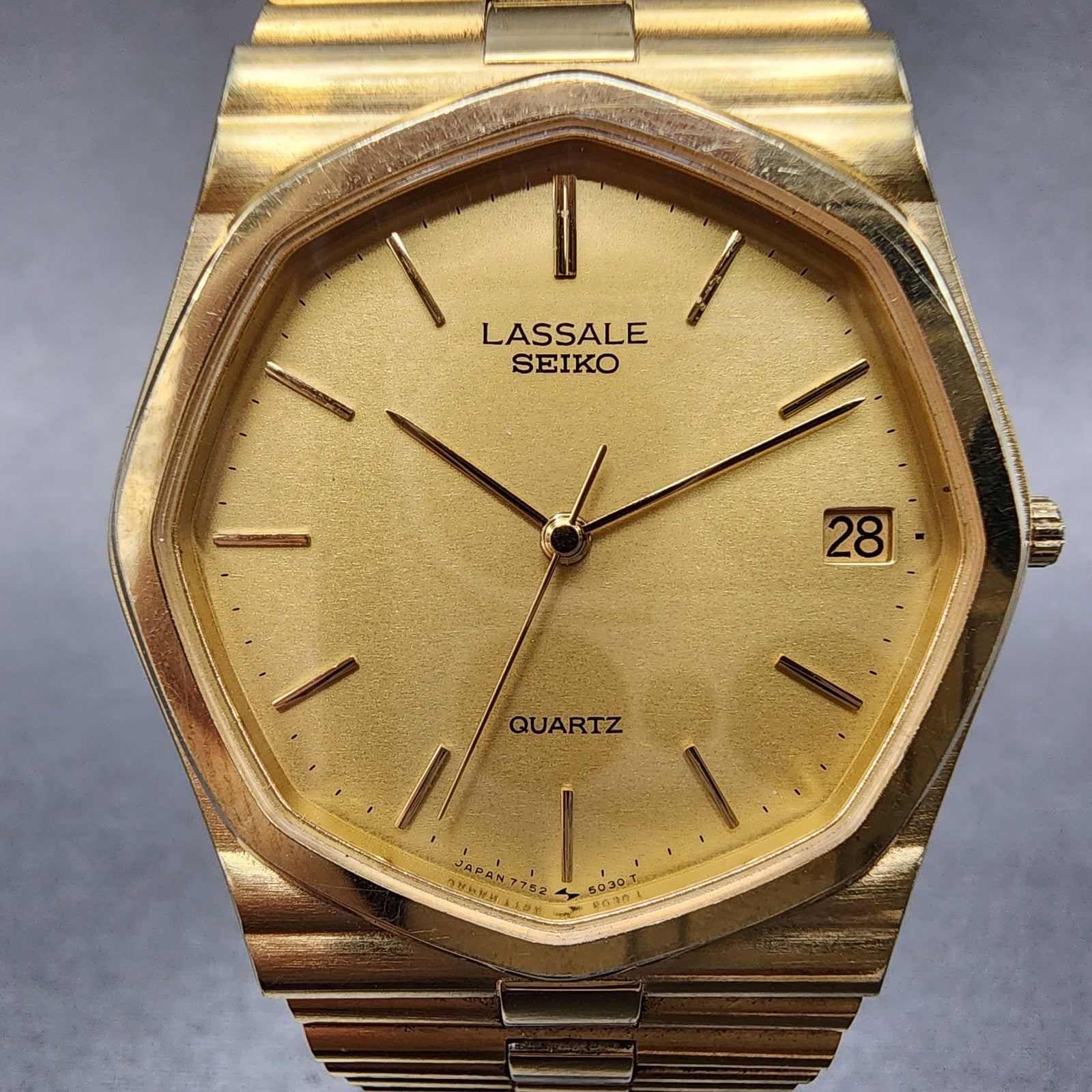 Seiko Lassale Watch Men 32mm Champagne Dial Gold Tone Date 7752-5019 New Battery