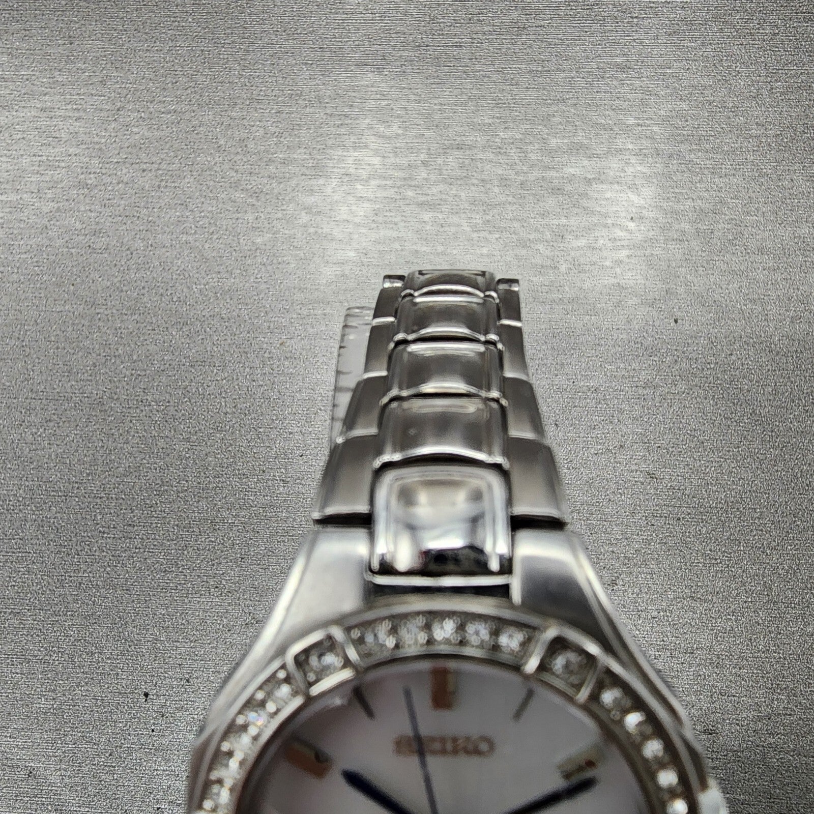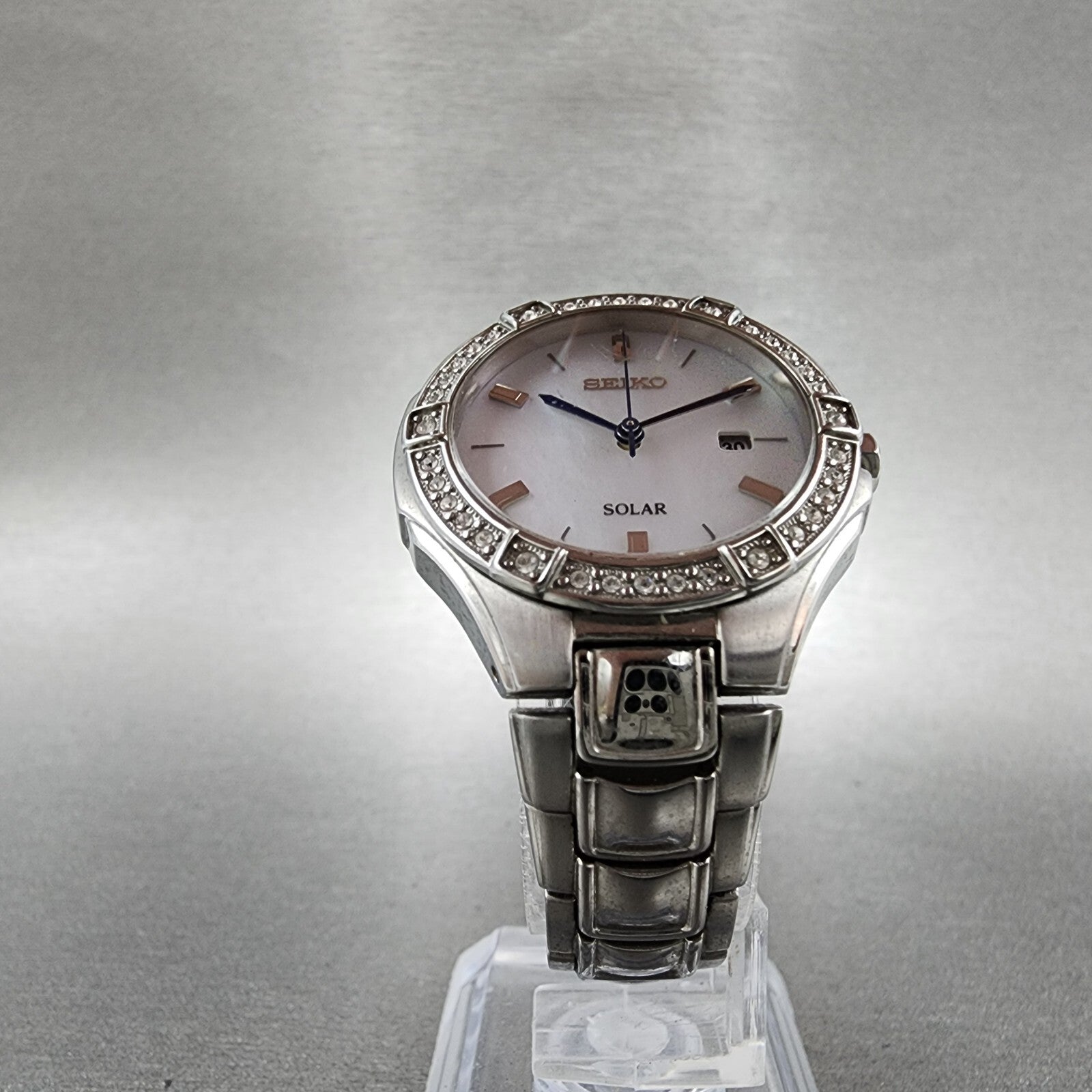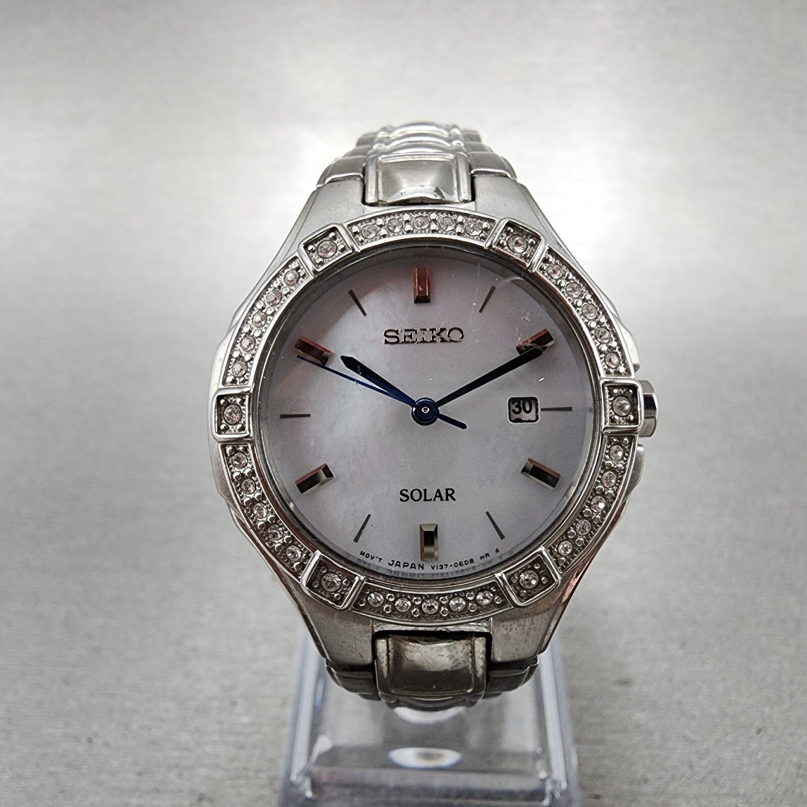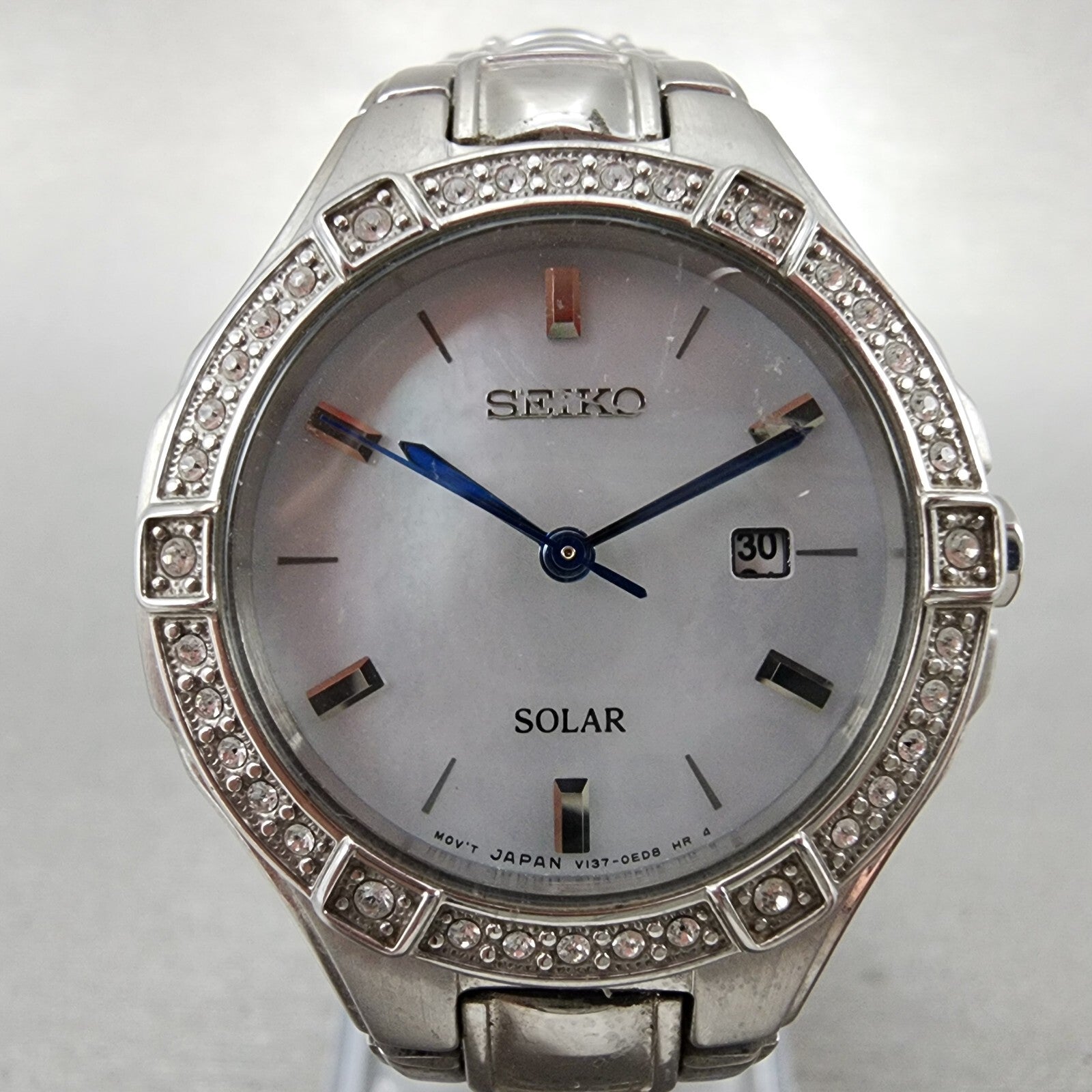 Seiko Solar Watch Women 31mm MOP Dial Silver Dial Date Round V137-0ca0 Runs