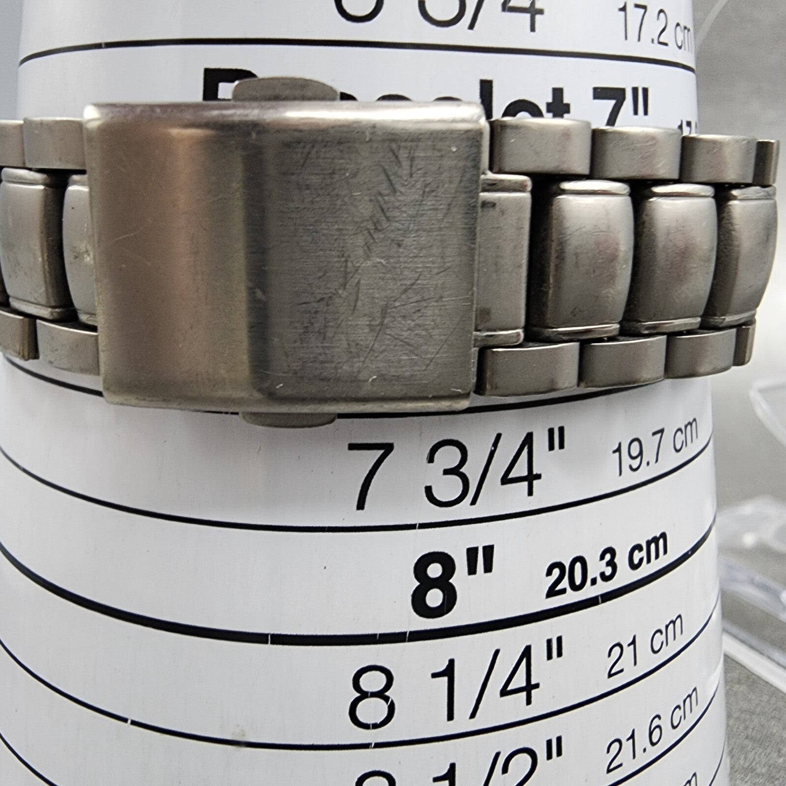 This item has been used and has scratchers on the case and crystal. The watch does not work and will need to be repaired. WILL AT LEAST NEED A NEW CAPACITOR. SOLD AS IS