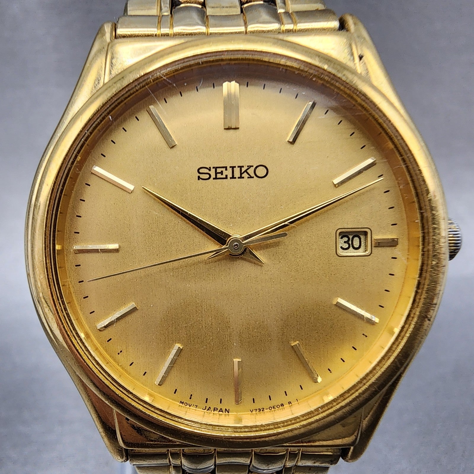 Seiko Watch Men 33mm Champagne Dial Gold Tone Date V732-0c49 New Battery