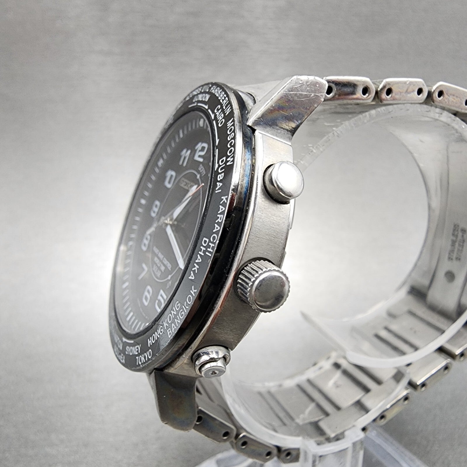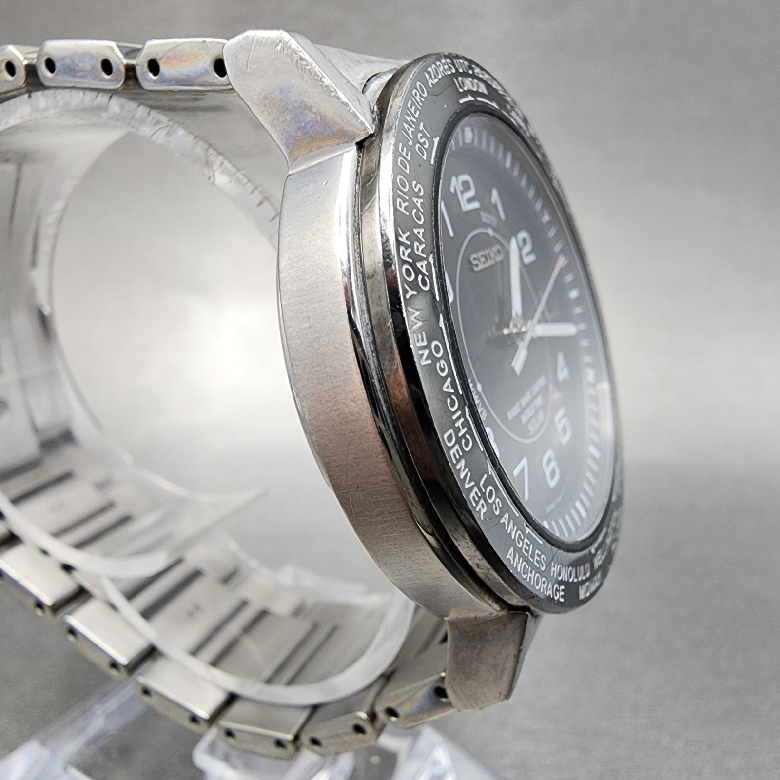 Seiko World Time Solar Watch Men 39mm Black Dial Silver Tone Date 7b25-0ad0 Runs