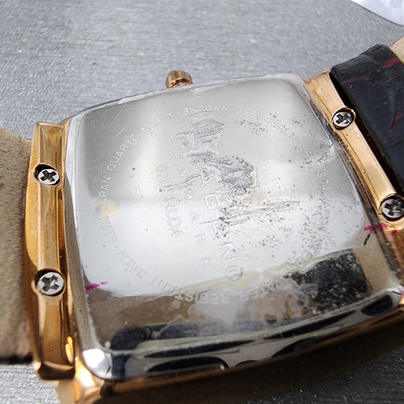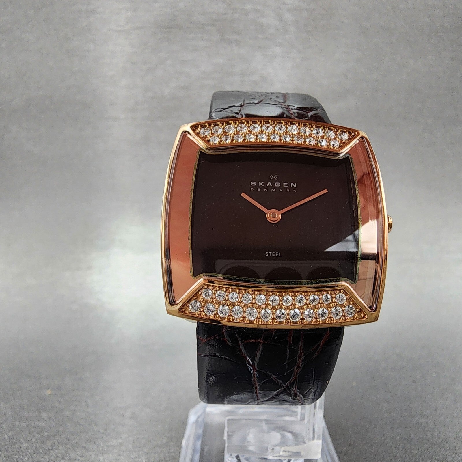 Skagen Watch Women 31mm Brown MOP Dial Rose Gold Tone Bling Bezel Rectangle Runs