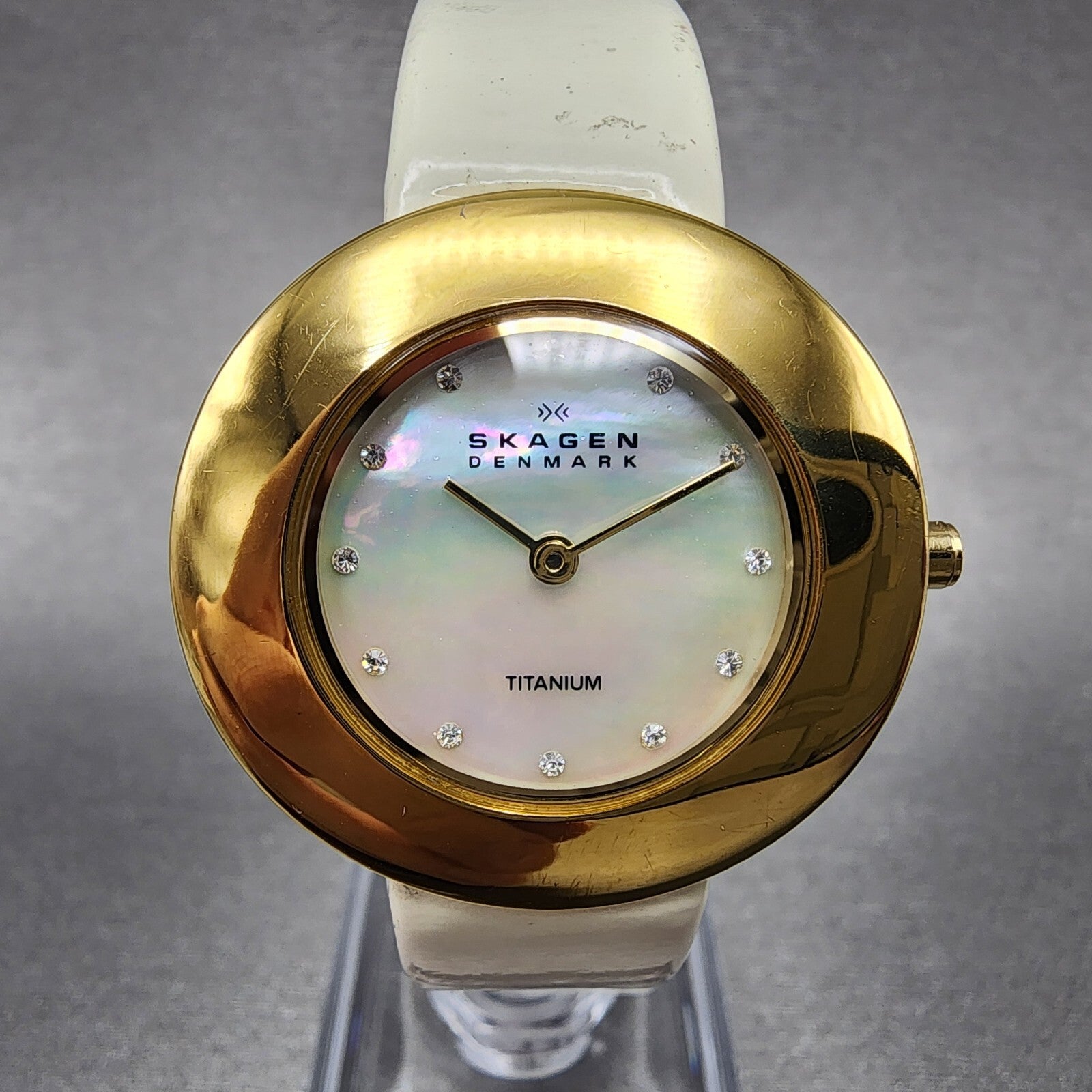 Skagen Watch Women 31mm MOP Dial Gold Tone Titanium Round 569STGLW New Battery