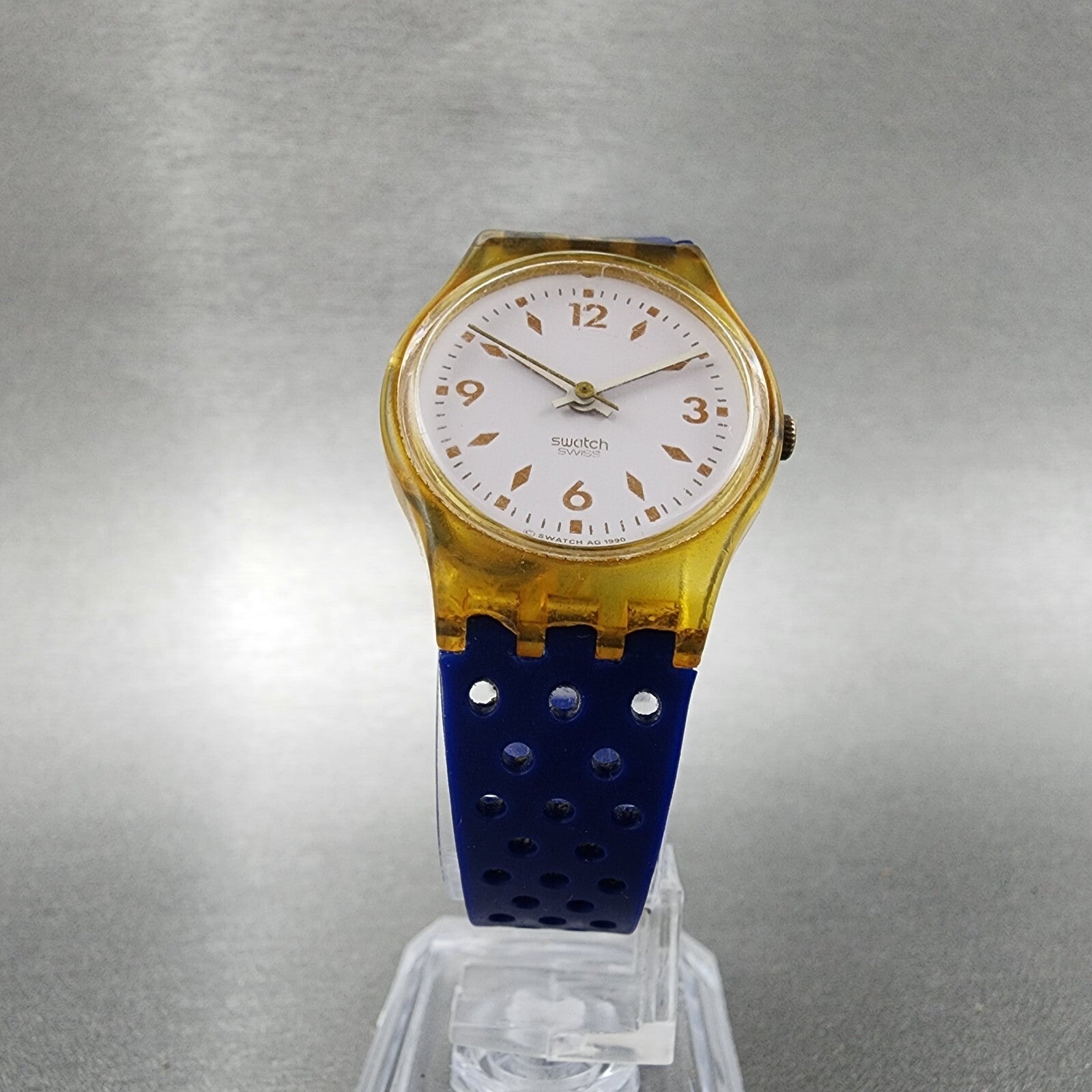 Swatch Gold Bride Watch Women 25mm White Dial Clear Case Round LK123 New Battery