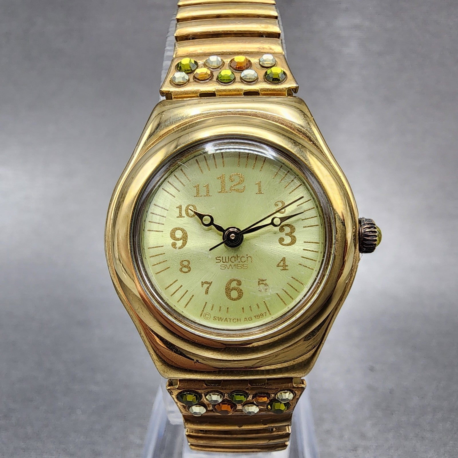 Swatch Irony FLORA Watch Women 25mm Champagne Dial Roes Gold Tone Round New Batt
