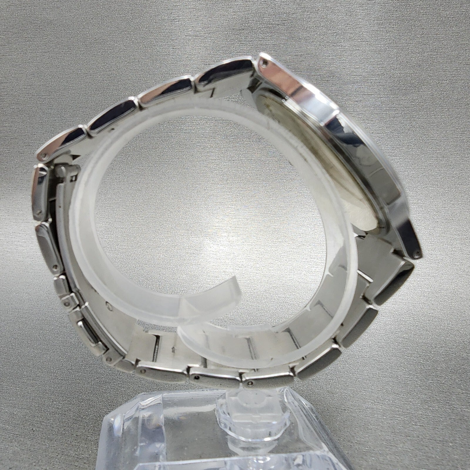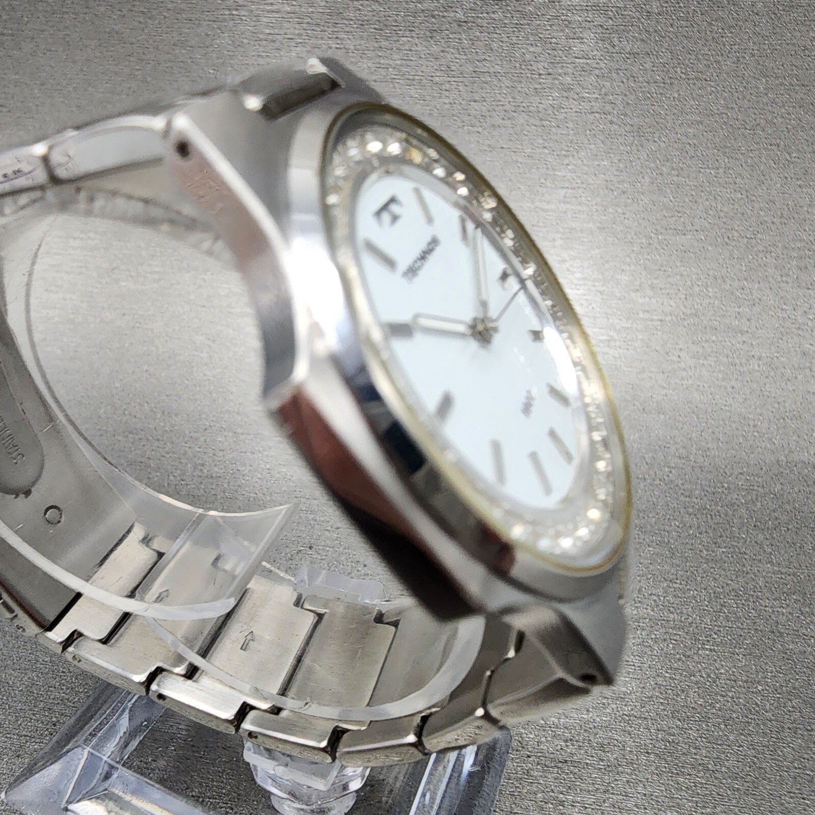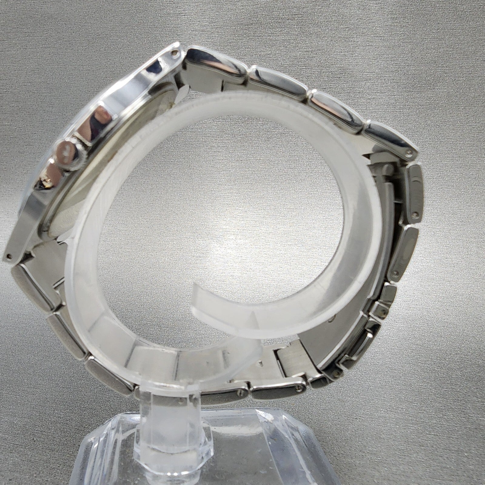 ONE OF CRYSTAL IN THE BEZEL IS LOSE AND FLOATING AROUND IN THE BEZEL. This watch has been used but is in good working condition. There is scratches on the watch. please refer to pictures.