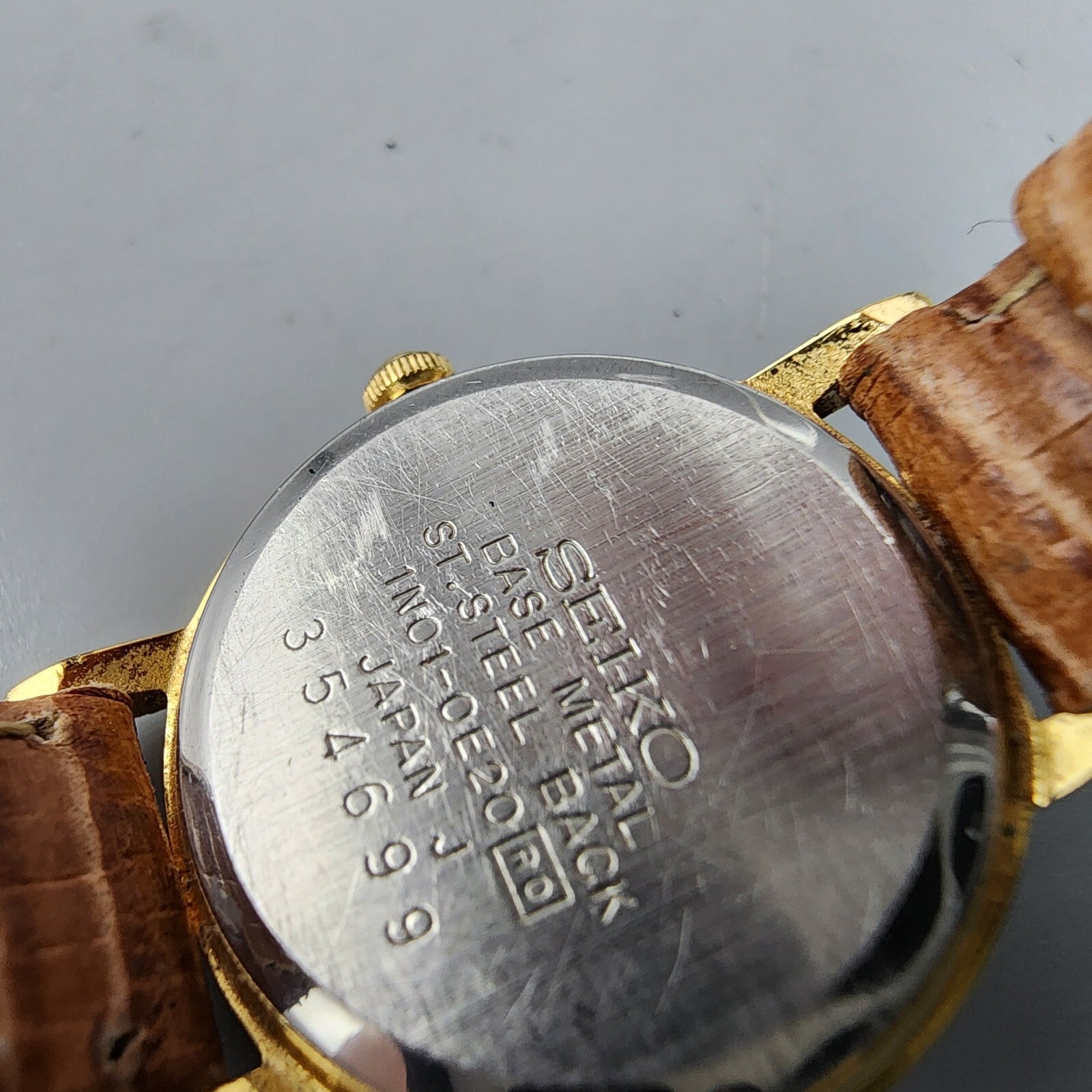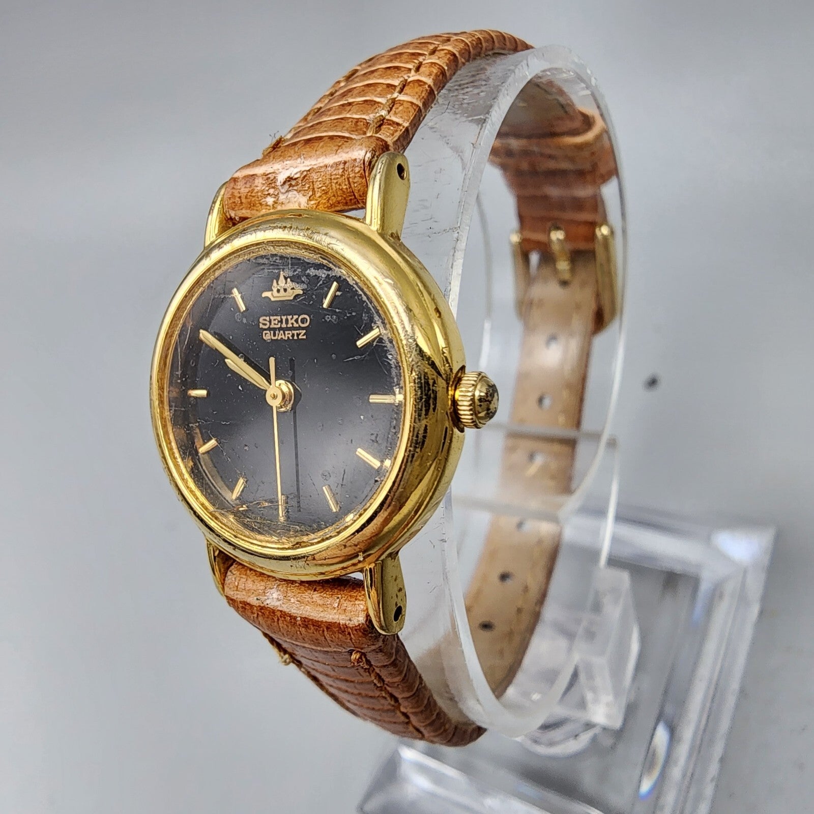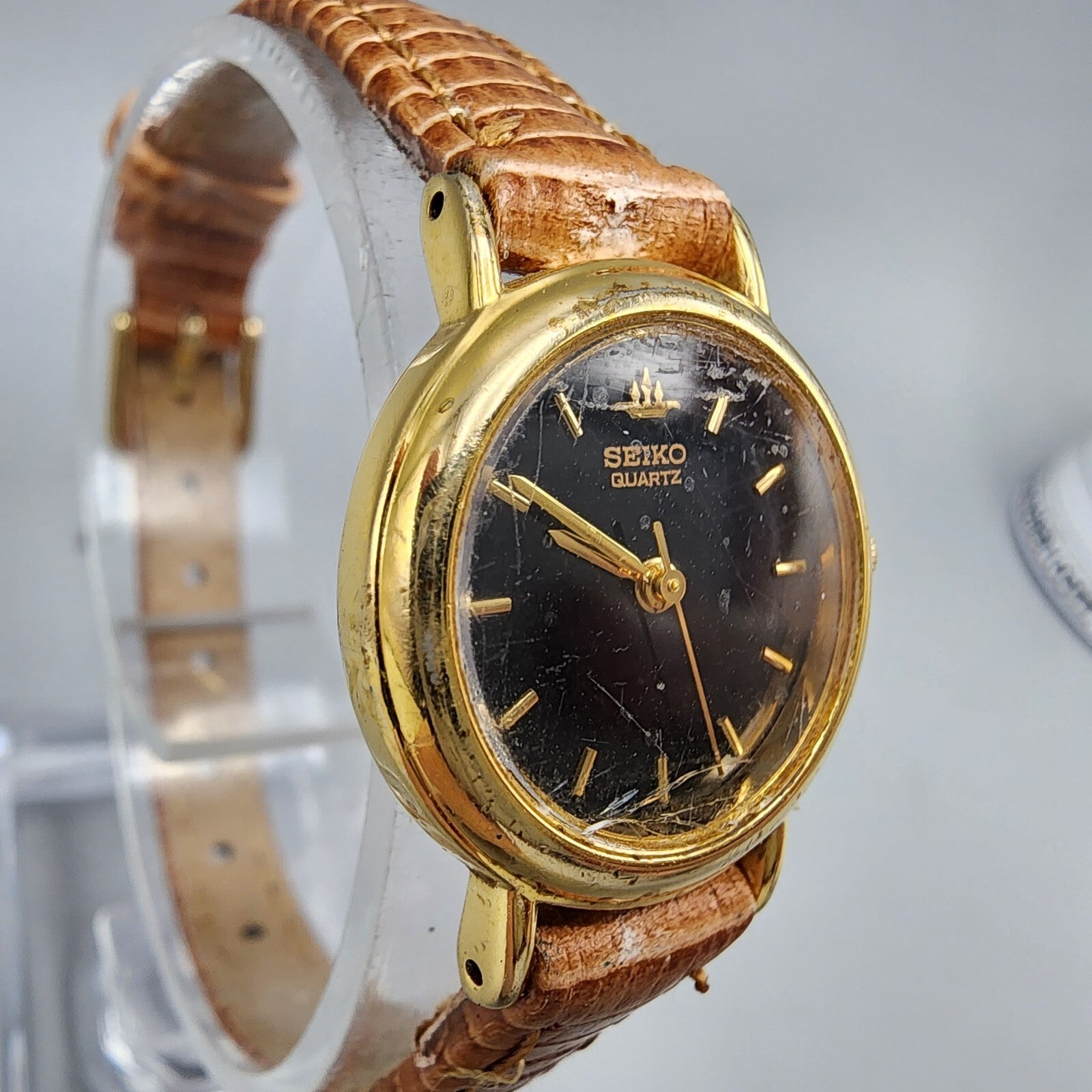 Vintage Seiko Watch Women Gold Tone Black Dial Round 1N01-0E20 New Battery