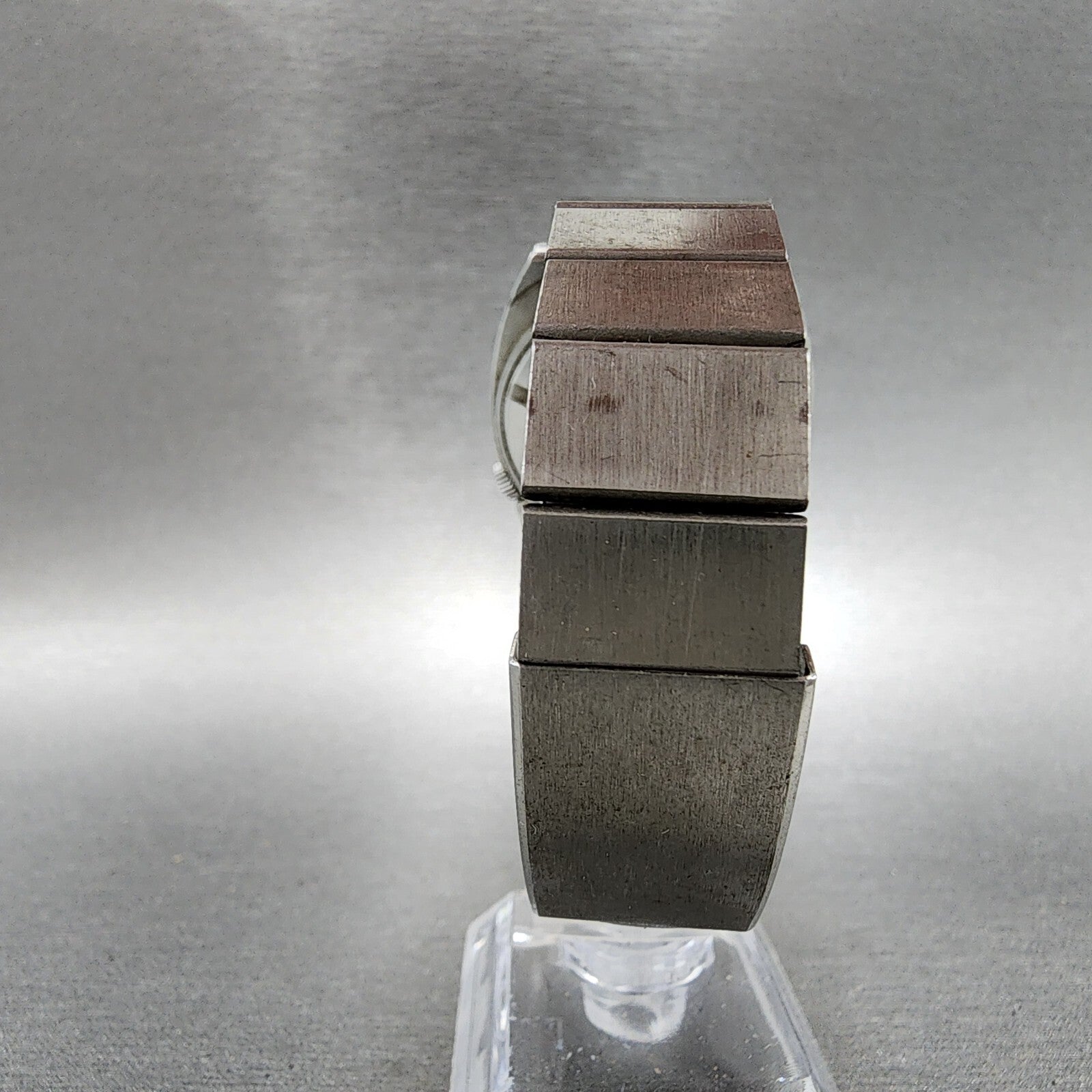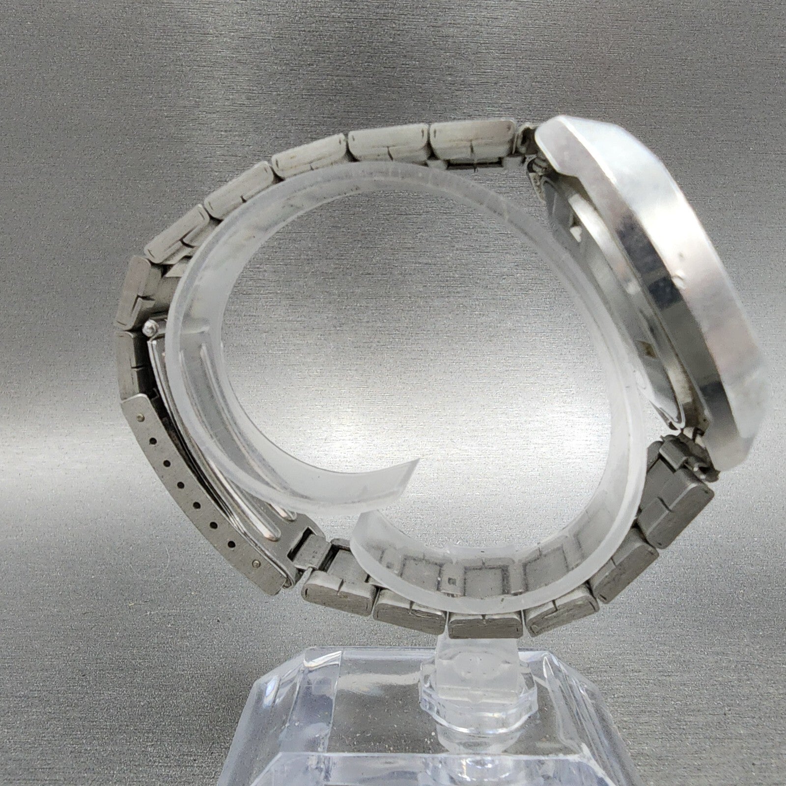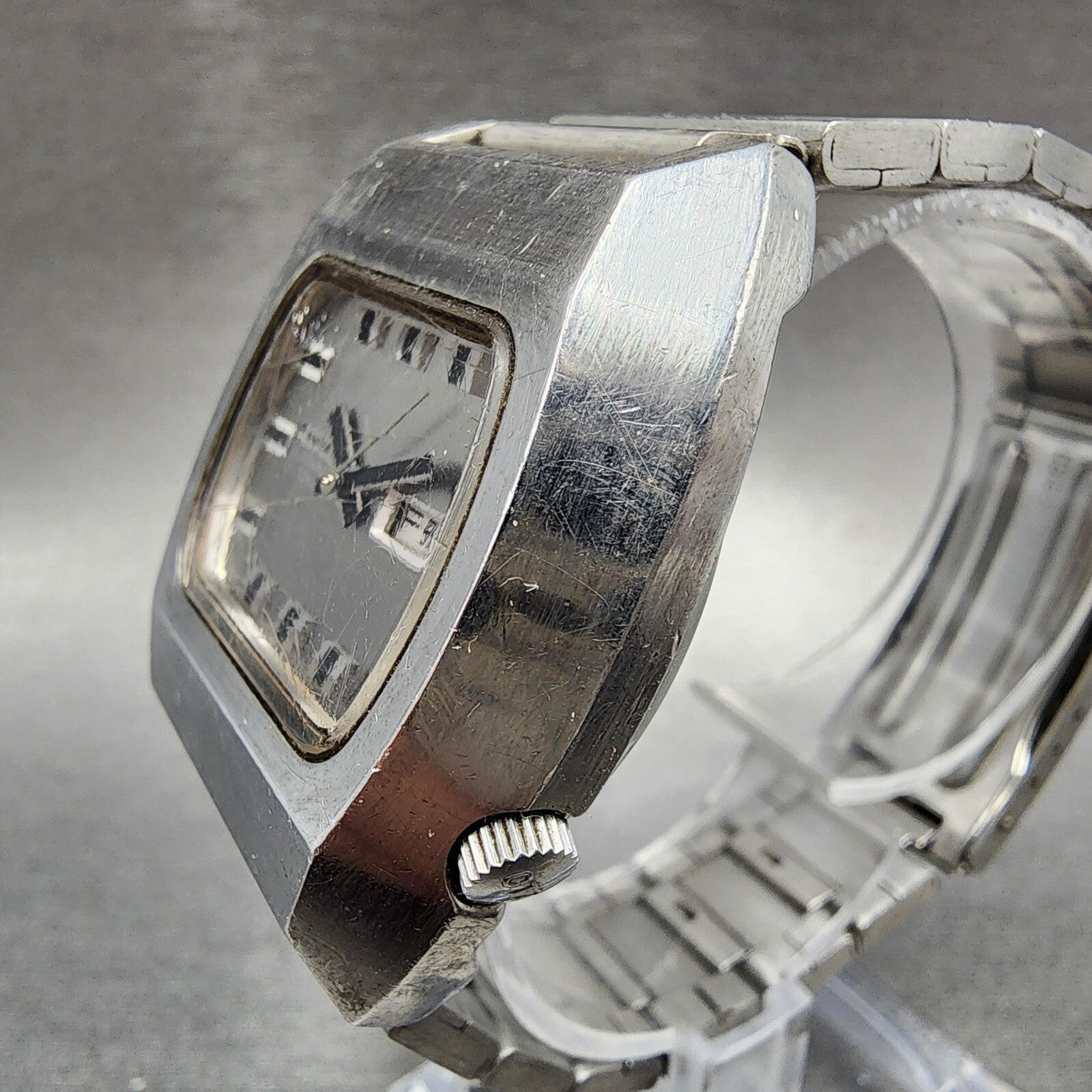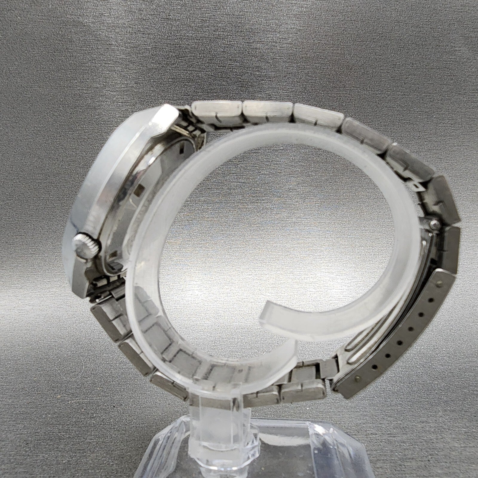 THE WATCH RUNS BUT THE DAY DISPLAY DOES NOT LINE UP PROPERLY SOMETIMES IT GETS STUCK IN A POSTION WERE IT IS BLANK. SOLD AS IS. THE CRYSTAL IS HEAVLIY SCRATCHED. There is scratches on the watch. please refer to pictures.