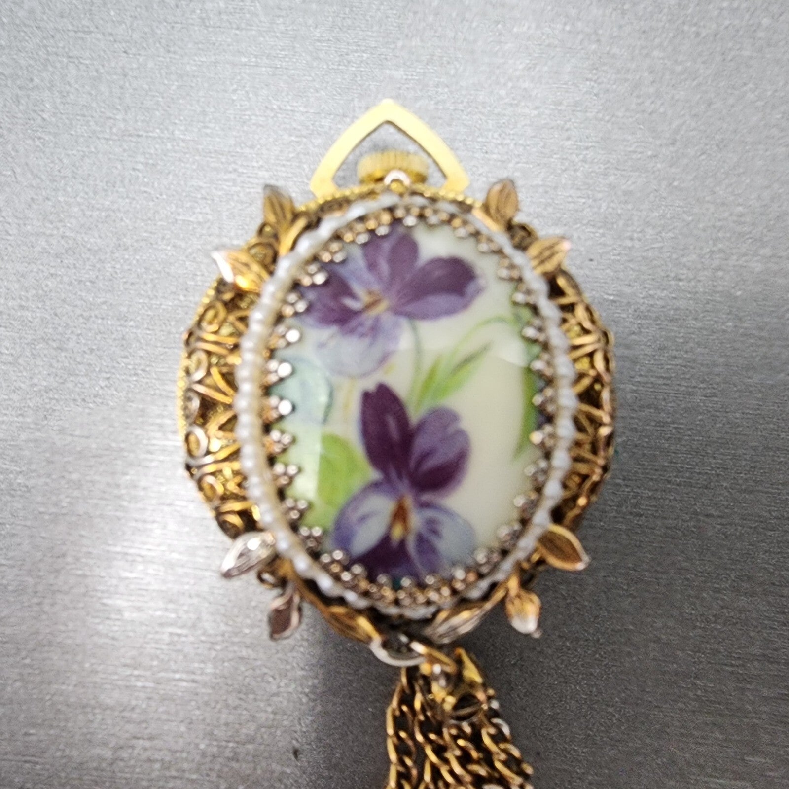 VTG Lucerne Pocket Watch Women Gold Tone Floral Brooch Round Manual Wind PARTS