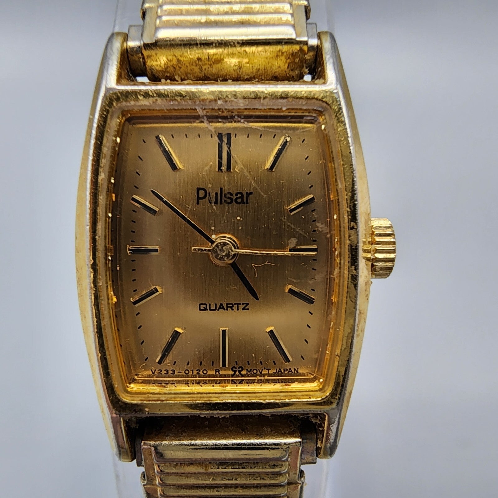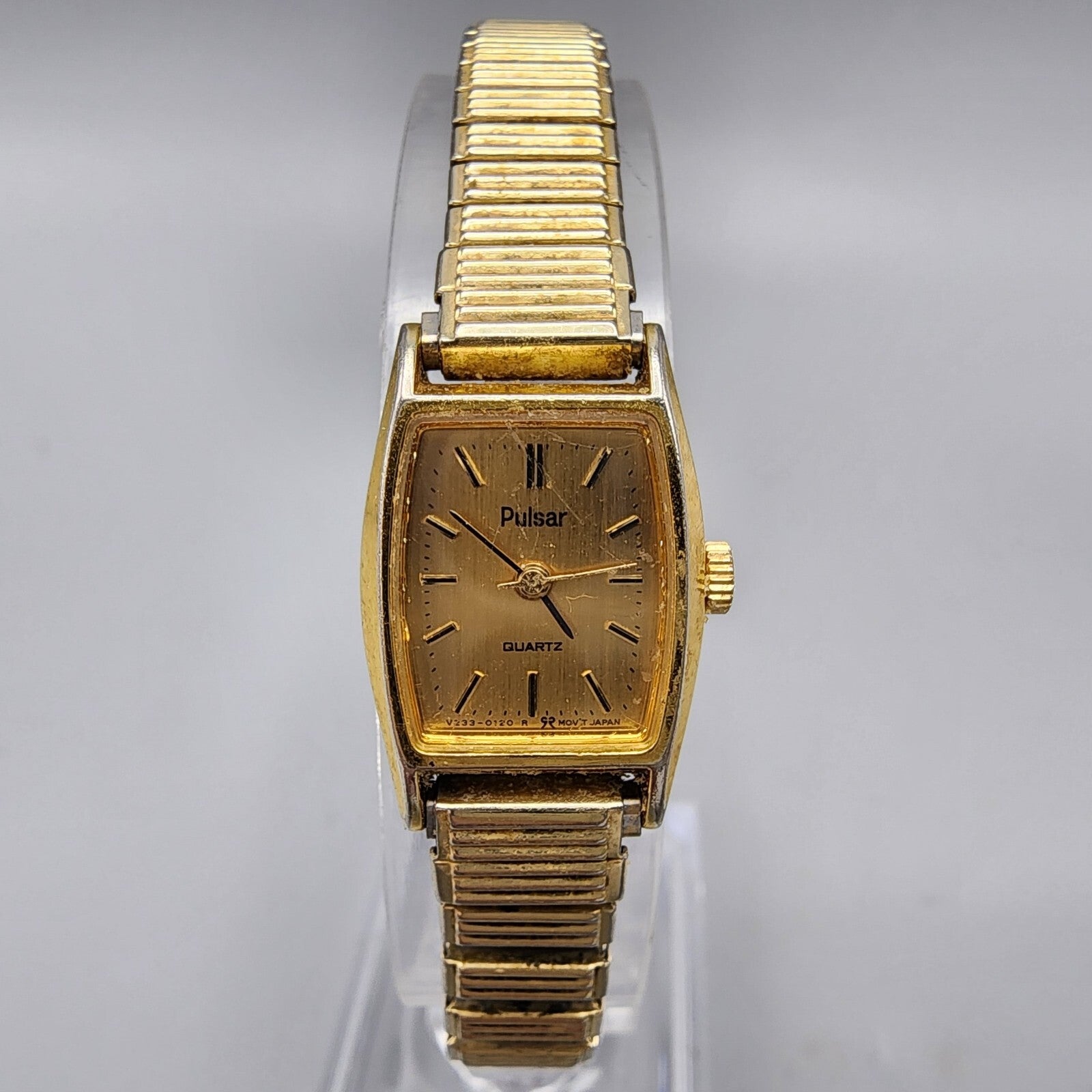 Vintage Pulsar Watch Women Gold Tone Rectangle 16mm V233-5100 Stretch Band New Battery