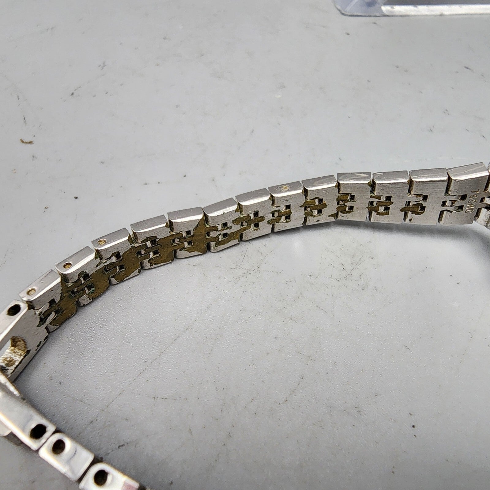 This item has been used and does have scratches on the crystal and case Please refer to pictures. Dial has some discoloartion and the band has plating wear.