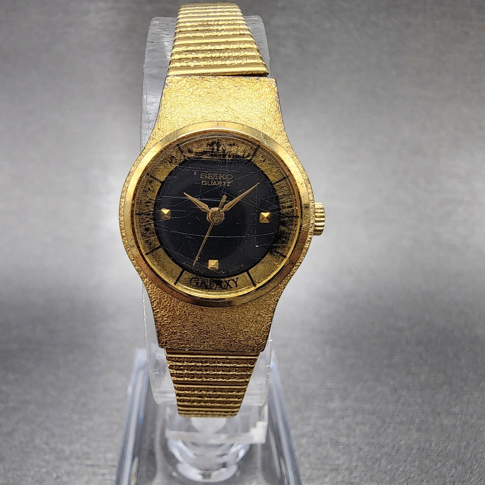 VTG Seiko Galaxy Watch Women 20mm Black Dial Gold Tone Round 8Y21-0030 New Batt