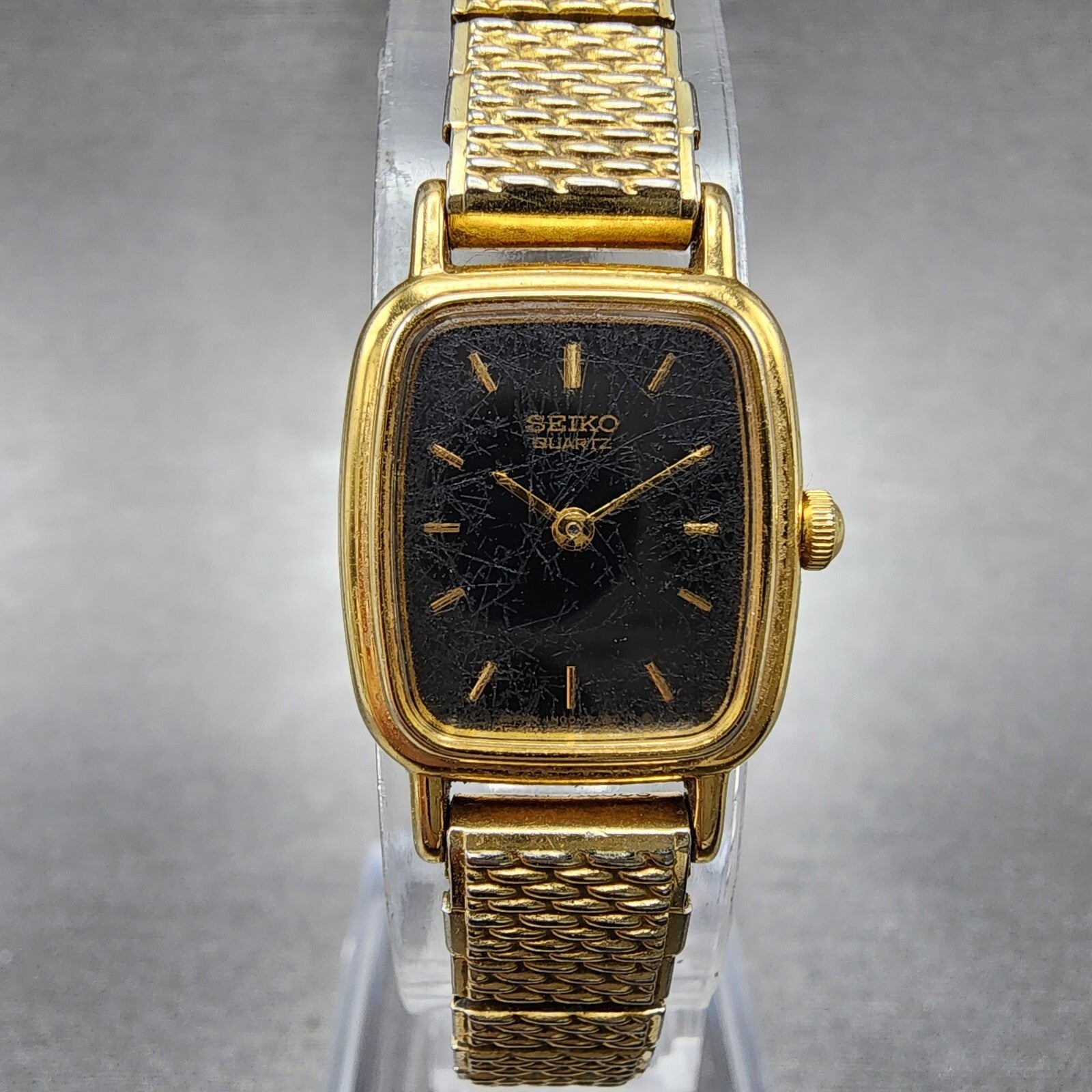 VTG Seiko Watch Women 17mm Black Dial Gold Tone Rectangle 1N00-5K29 New Battery